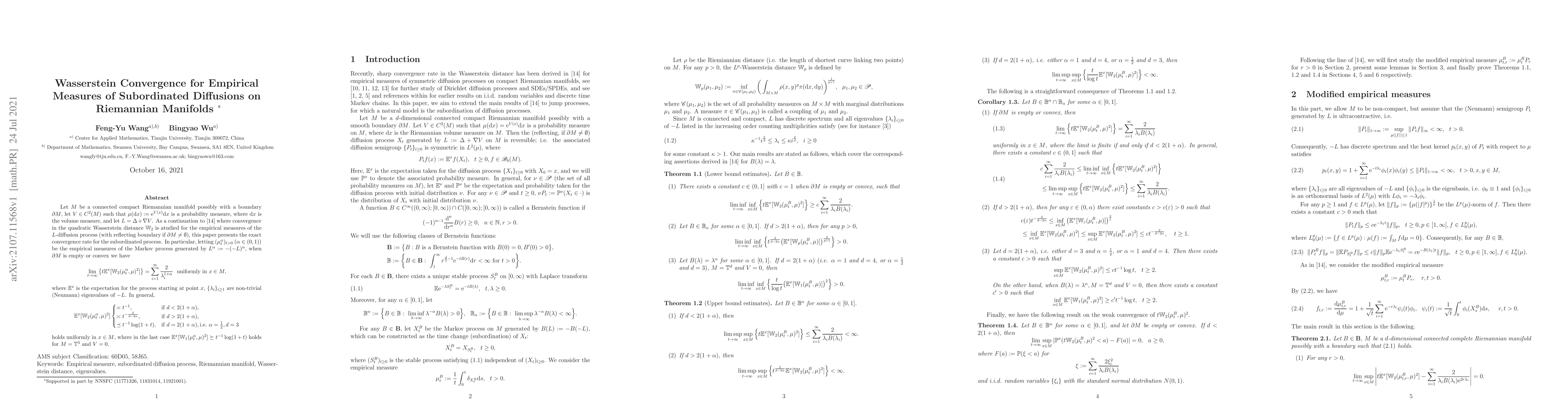 Let $M$ be a connected compact Riemannian manifold possibly with a boundary, let $V\in C^2(M)$ such that $\mu(\d x):=\e^{V(x)}\d x$ is a probability measure, where $\d x$ is the volume measure, and let $L=\Delta+\nabla V$. The exact convergence rate in Wasserstein distance is derived for empirical measures of subordinations for the (reflecting) diffusion process generated by $L$.