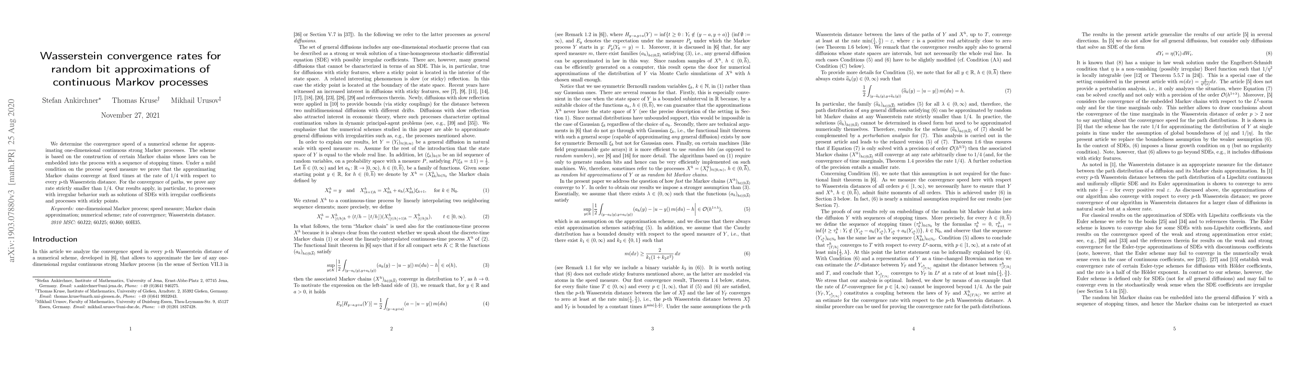 This paper investigates the convergence rate of random bit approximations for one-dimensional continuous Markov processes, showing that the approximating Markov chains converge at a rate of $1/4$ in Wasserstein distance. It also proves that no faster rate is achievable for path convergence, with applications to irregular processes like SDEs with irregular coefficients.