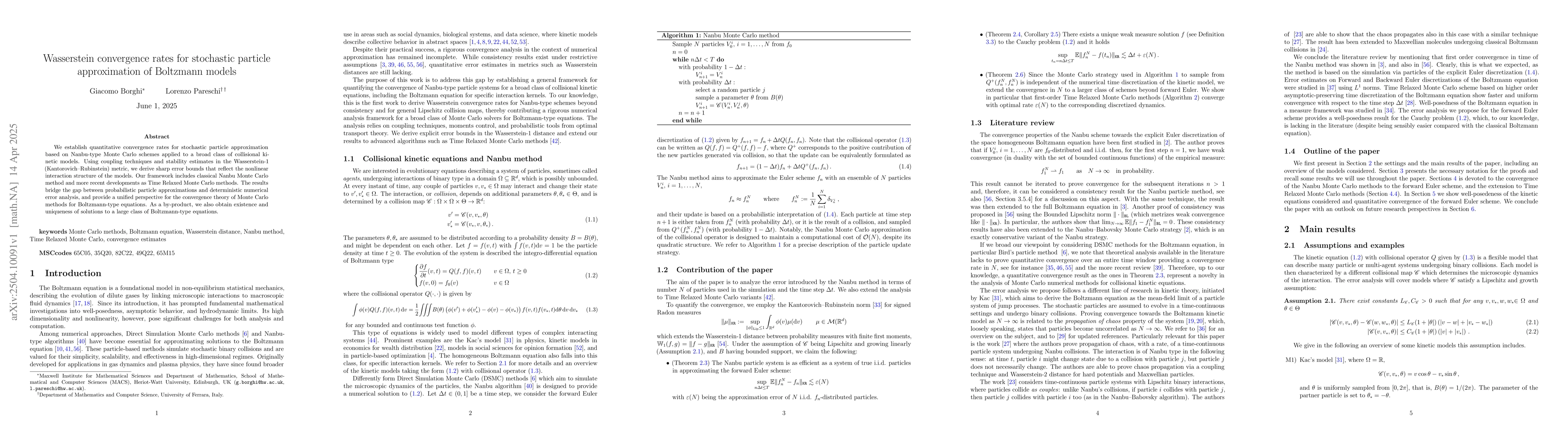 The research establishes quantitative convergence rates for stochastic particle approximation of collisional kinetic models using Nanbu-type Monte Carlo schemes in the Wasserstein-1 metric, bridging probabilistic particle approximations with deterministic numerical error analysis.