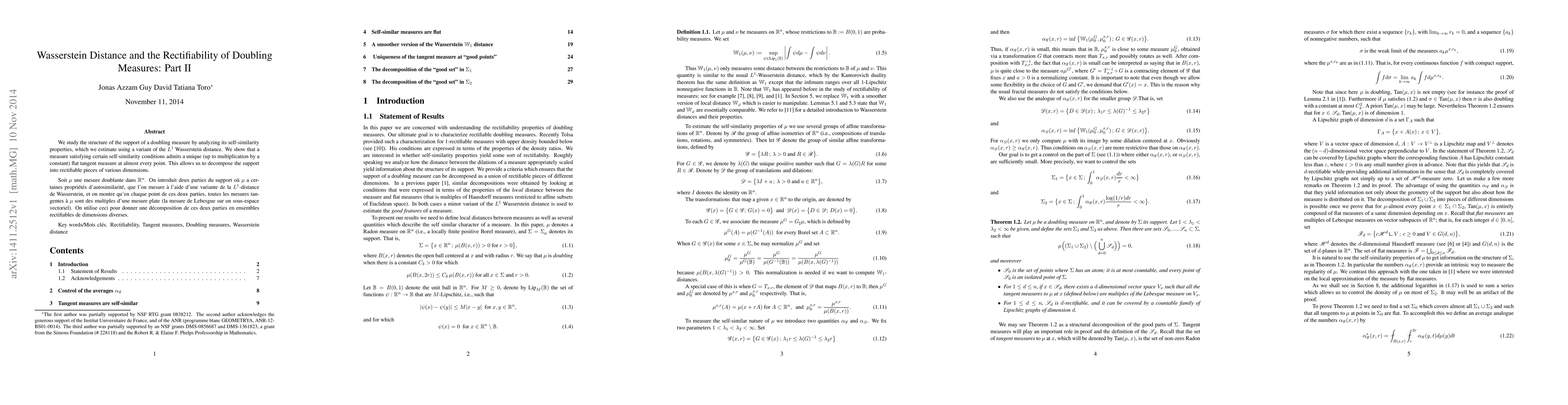 We study the structure of the support of a doubling measure by analyzing its self-similarity properties, which we estimate using a variant of the $L^1$ Wasserstein distance. We show that measure satisfying certain self-similarity conditions admits a unique (up to multiplication by a constant) flat tangent measure at almost every point. This allows us to decompose the support into rectifiable pieces of various dimensions.