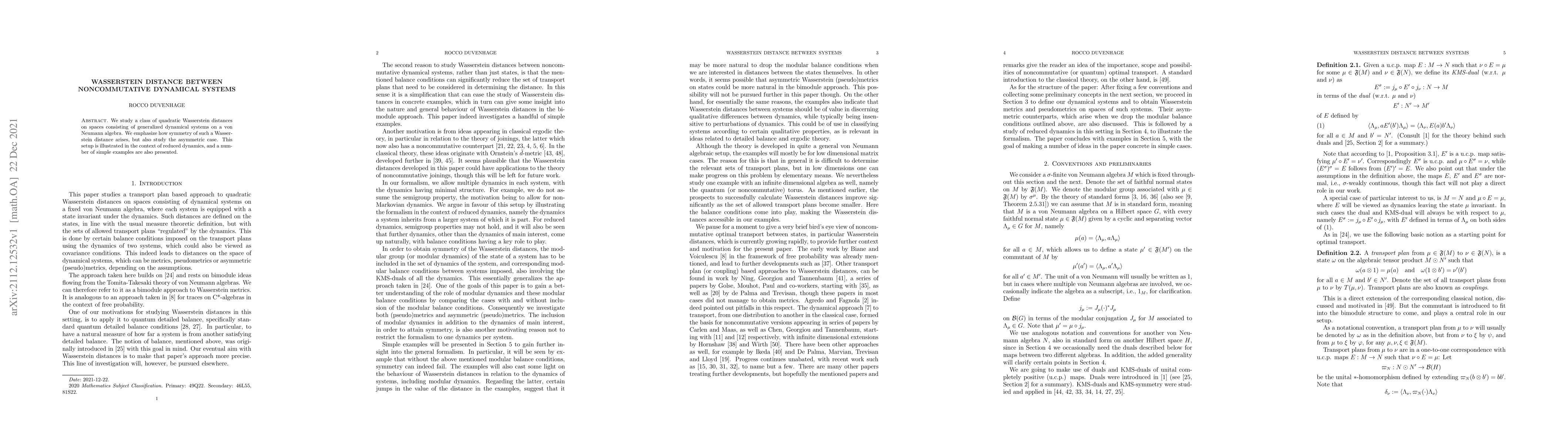 We study a class of quadratic Wasserstein distances on spaces consisting of generalized dynamical systems on a von Neumann algebra. We emphasize how symmetry of such a Wasserstein distance arises, but also study the asymmetric case. This setup is illustrated in the context of reduced dynamics, and a number of simple examples are also presented.