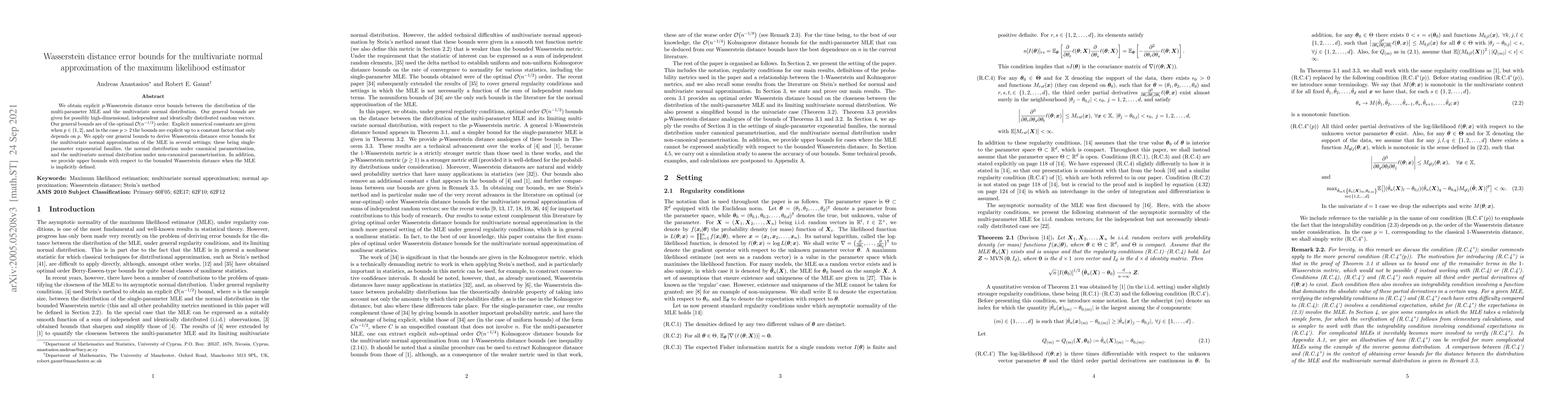 The paper employs a theoretical approach to derive explicit p-Wasserstein distance error bounds for the multivariate normal approximation of the maximum likelihood estimator (MLE) for independent and identically distributed (i.i.d.) random vectors, with bounds optimal in order O(n^(-1/2)) and explicit numerical constants provided for p ∈ (1, 2] and up to a constant factor for p > 2.