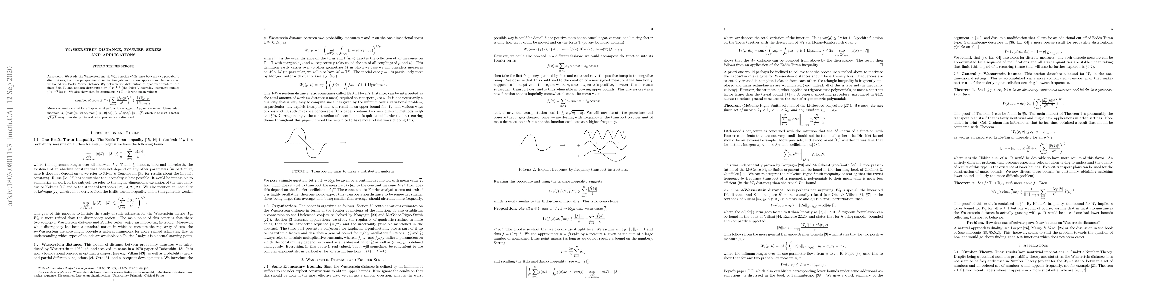 We study the Wasserstein metric $W_p$, a notion of distance between two probability distributions, from the perspective of Fourier Analysis and discuss applications. In particular, we bound the Earth Mover Distance $W_1$ between the distribution of quadratic residues in a finite field $\mathbb{F}_p$ and uniform distribution by $\lesssim p^{-1/2}$ (the Polya-Vinogradov inequality implies $\lesssim p^{-1/2} \log{p}$). We also show for continuous $f:\mathbb{T} \rightarrow \mathbb{R}_{}$ with mean value 0 $$ (\mbox{number of roots of}~f) \cdot \left( \sum_{k=1}^{\infty}{ \frac{ |\hat{f}(k)|^2}{k^2}}\right)^{\frac{1}{2}} \gtrsim \frac{\|f\|^{2}_{L^1(\mathbb{T})}}{\|f\|_{L^{\infty}(\mathbb{T})}}.$$ Moreover, we show that for a Laplacian eigenfunction $-\Delta_g \phi_{\lambda} = \lambda \phi_{\lambda}$ on a compact Riemannian manifold $W_p\left(\max\left\{\phi_{\lambda}, 0\right\}dx, \max\left\{-\phi_{\lambda}, 0\right\} dx\right) \lesssim_p \sqrt{\log{\lambda}/\lambda} \|\phi_{\lambda}\|_{L^1}^{1/p}$ which is at most a factor $\sqrt{\log{\lambda}}$ away from sharp. Several other problems are discussed.
