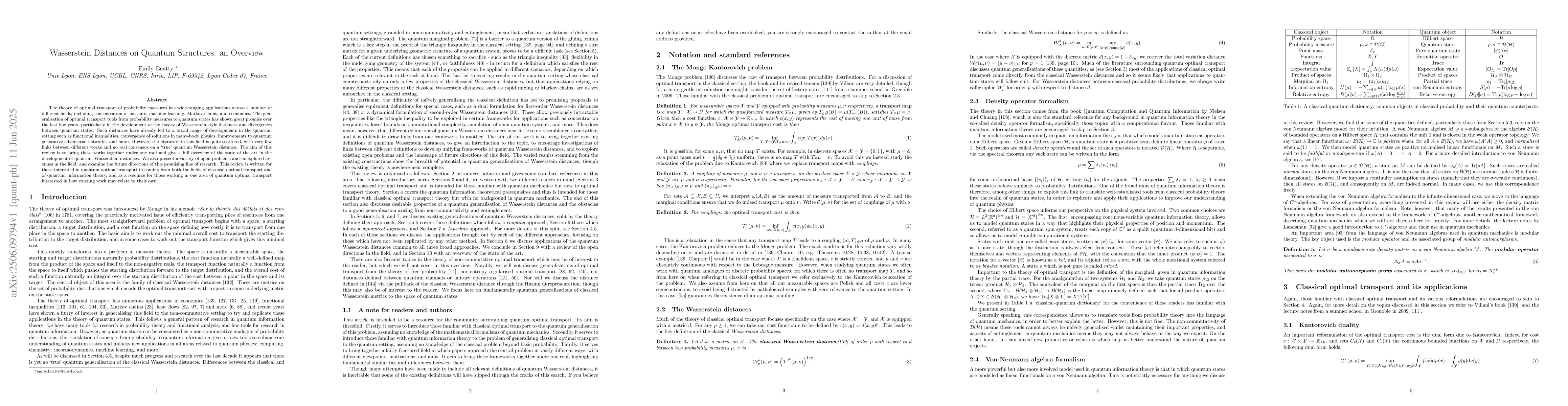 This review paper brings together existing research on quantum Wasserstein distances, a promising tool for studying quantum systems, and highlights its applications in fields like physics and machine learning. It also explores open problems and future directions for this rapidly evolving field of quantum optimal transport.