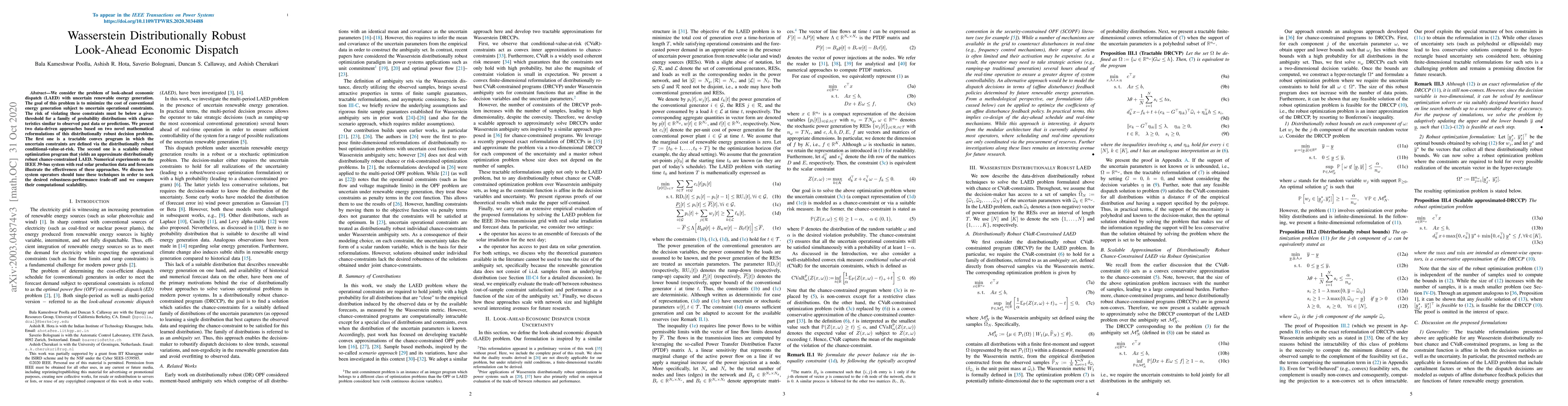 This paper proposes two data-driven approaches for look-ahead economic dispatch under renewable energy uncertainty, reformulating the distributionally robust decision problem into a tractable convex program and a scalable robust optimization program. Numerical experiments demonstrate their effectiveness and scalability.
