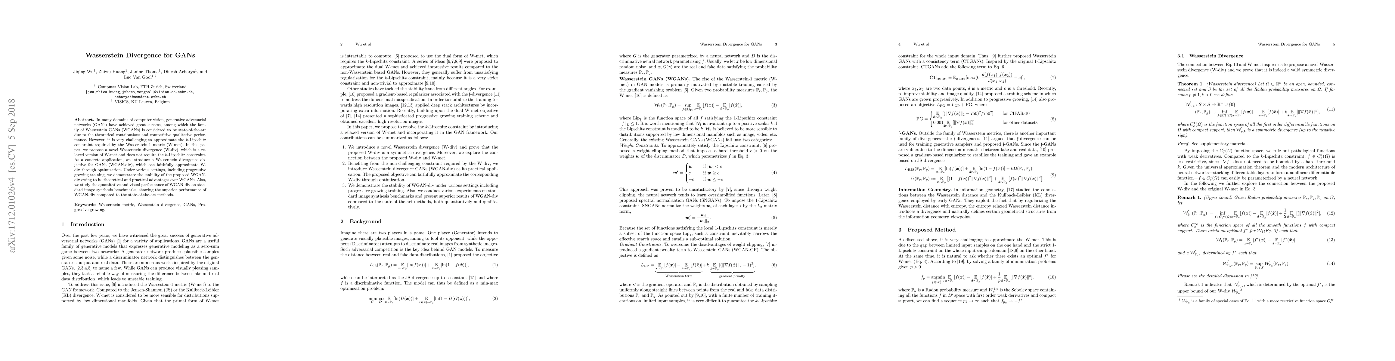 The paper proposes a novel Wasserstein divergence (W-div) for Generative Adversarial Networks (GANs) that relaxes the k-Lipschitz constraint required by the Wasserstein-1 metric (W-met). It introduces Wasserstein divergence objective for GANs (WGAN-div) which approximates W-div through optimization, demonstrating stability and superior performance over WGANs.
