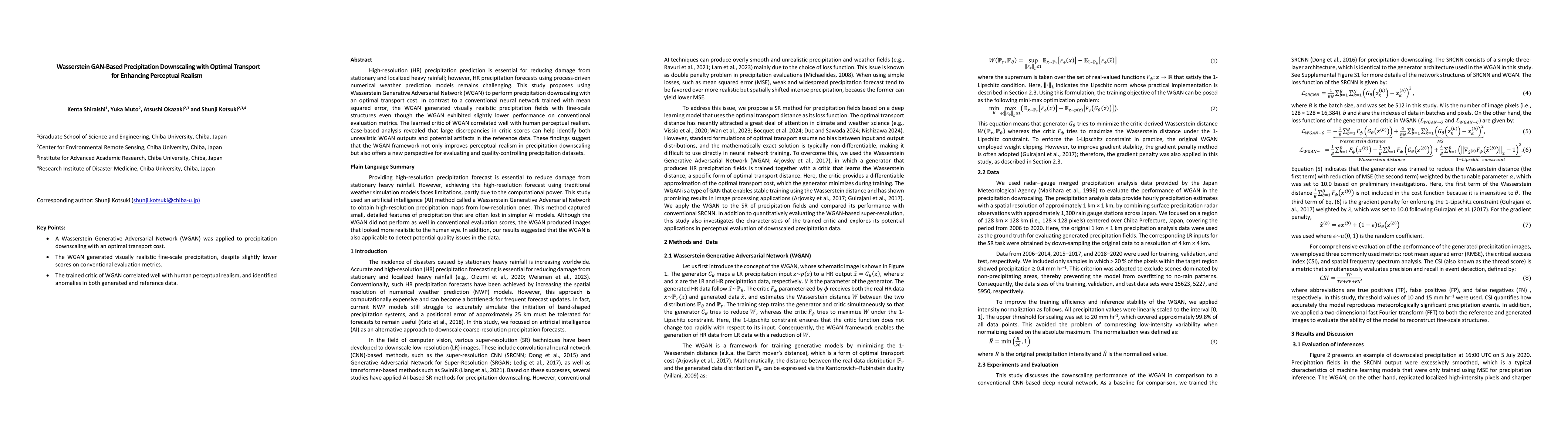 This study proposed using Wasserstein Generative Adversarial Network (WGAN) for precipitation downscaling with optimal transport cost.