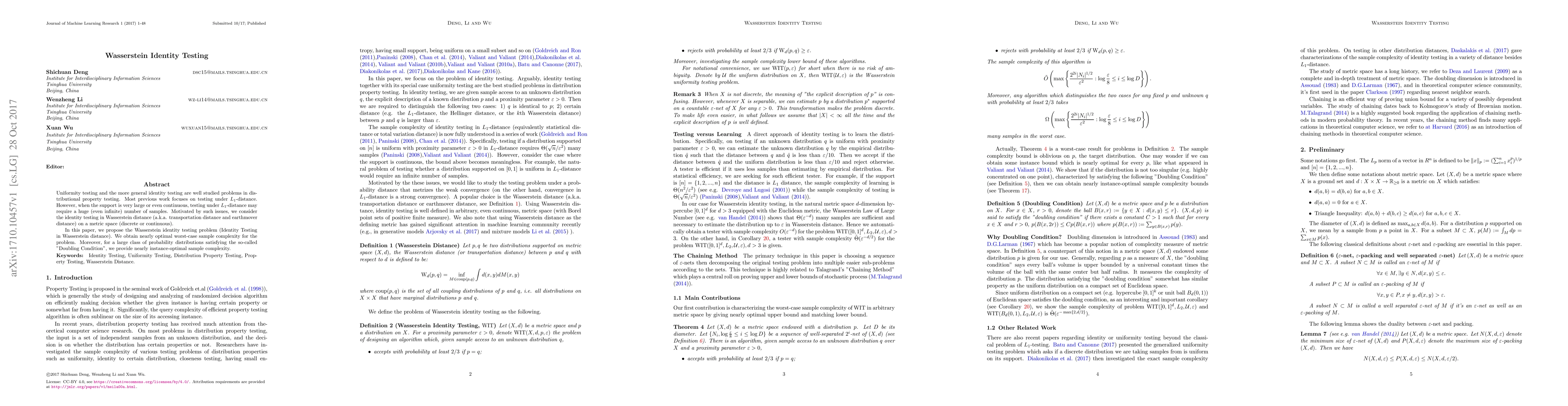 This paper introduces the Wasserstein identity testing problem, focusing on testing distributions under Wasserstein distance rather than $L_1$-distance to handle large or continuous supports efficiently. It presents nearly optimal sample complexity for this problem and nearly instance-optimal complexity for distributions meeting the Doubling Condition.