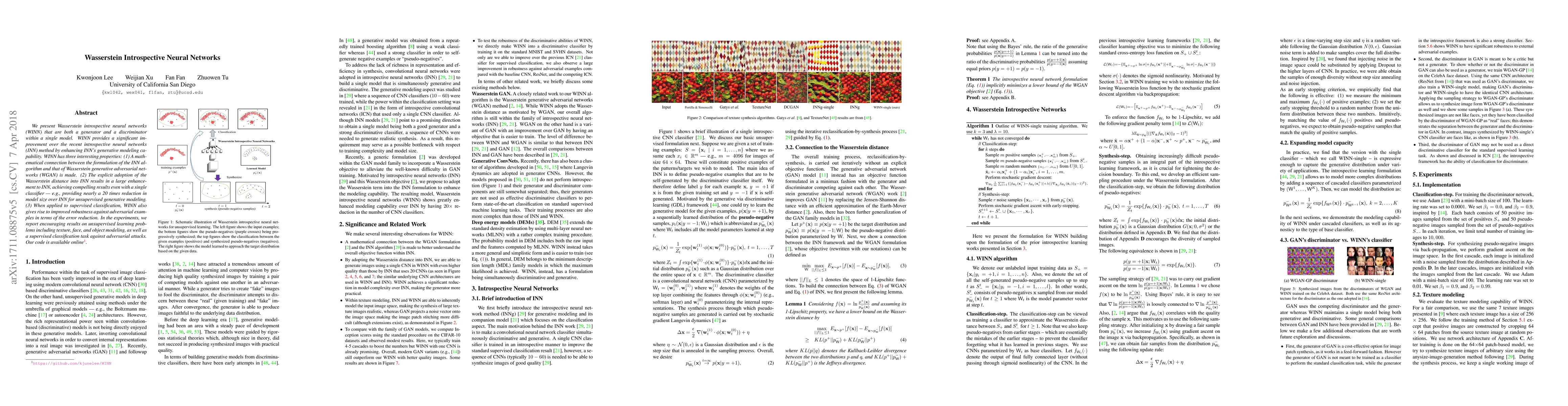 Wasserstein introspective neural networks (WINN) combine generator and discriminator functions within a single model, significantly improving generative modeling over introspective neural networks (INN). WINN achieves enhanced results by integrating the Wasserstein distance, leading to substantial reductions in model size and improved robustness against adversarial examples.