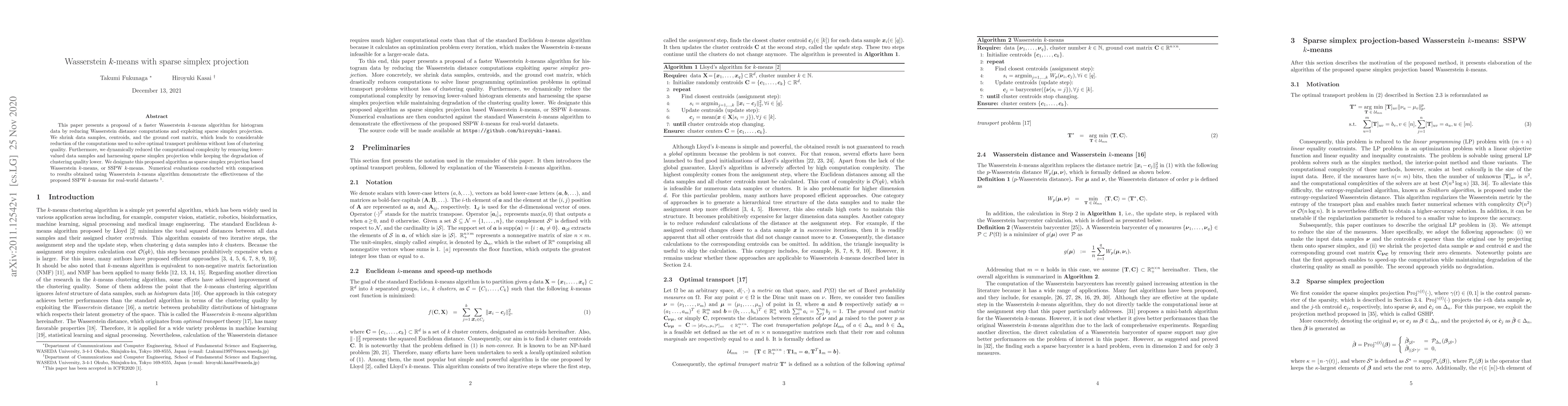 This paper introduces a faster Wasserstein $k$-means algorithm, SSPW $k$-means, which reduces computational complexity through sparse simplex projection and dynamic sample removal, maintaining clustering quality for histogram data. Numerical evaluations show its effectiveness compared to traditional Wasserstein $k$-means.