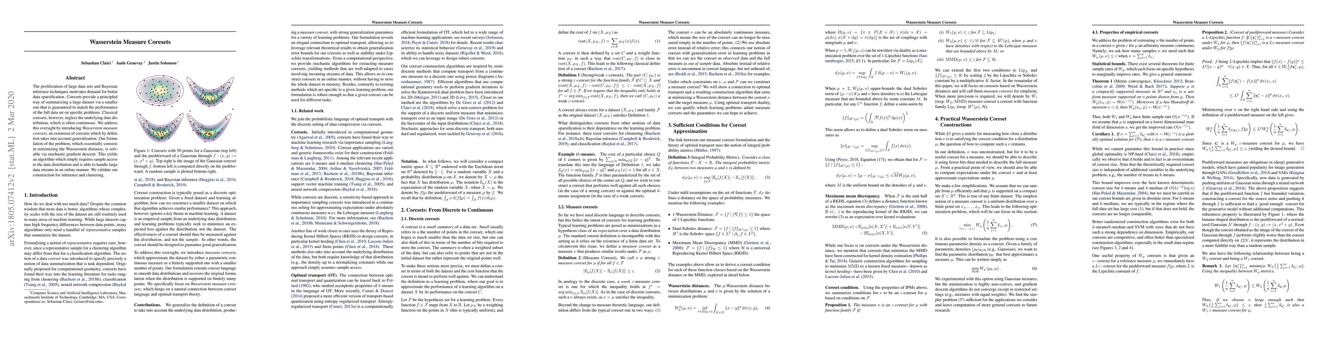 The proliferation of large data sets and Bayesian inference techniques motivates demand for better data sparsification. Coresets provide a principled way of summarizing a large dataset via a smaller one that is guaranteed to match the performance of the full data set on specific problems. Classical coresets, however, neglect the underlying data distribution, which is often continuous. We address this oversight by introducing Wasserstein measure coresets, an extension of coresets which by definition takes into account generalization. Our formulation of the problem, which essentially consists in minimizing the Wasserstein distance, is solvable via stochastic gradient descent. This yields an algorithm which simply requires sample access to the data distribution and is able to handle large data streams in an online manner. We validate our construction for inference and clustering.