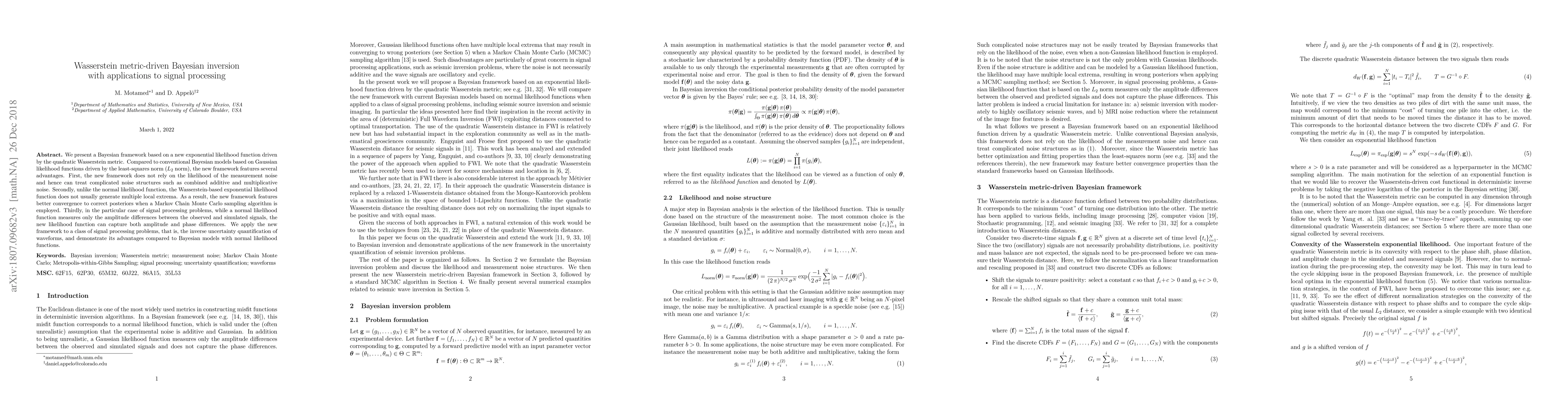 We present a Bayesian framework based on a new exponential likelihood function driven by the quadratic Wasserstien metric. Compared to conventional Bayesian models based on Gaussian likelihood functions driven by the least-squares norm ($L_2$ norm), the new framework features several advantages. First, the new framework does not rely on the likelihood of the measurement noise and hence can treat complicated noise structures such as combined additive and multiplicative noise. Secondly, unlike the normal likelihood function, the Wasserstein-based exponential likelihood function does not usually generate multiple local extrema. As a result, the new framework features better convergence to correct posteriors when a Markov Chain Monte Carlo sampling algorithm is employed. Thirdly, in the particular case of signal processing problems, while a normal likelihood function measures only the amplitude differences between the observed and simulated signals, the new likelihood function can capture both the amplitude and the phase differences. We apply the new framework to a class of signal processing problems, that is, the inverse uncertainty quantification of waveforms, and demonstrate its advantages compared to Bayesian models with normal likelihood functions.