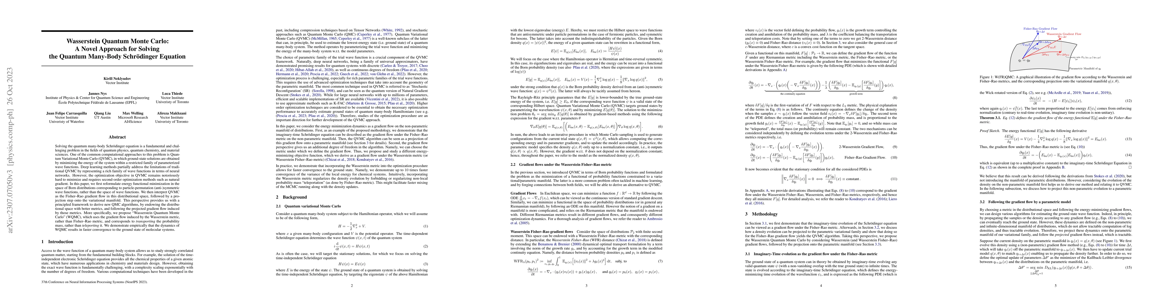 Solving the quantum many-body Schr\"odinger equation is a fundamental and challenging problem in the fields of quantum physics, quantum chemistry, and material sciences. One of the common computational approaches to this problem is Quantum Variational Monte Carlo (QVMC), in which ground-state solutions are obtained by minimizing the energy of the system within a restricted family of parameterized wave functions. Deep learning methods partially address the limitations of traditional QVMC by representing a rich family of wave functions in terms of neural networks. However, the optimization objective in QVMC remains notoriously hard to minimize and requires second-order optimization methods such as natural gradient. In this paper, we first reformulate energy functional minimization in the space of Born distributions corresponding to particle-permutation (anti-)symmetric wave functions, rather than the space of wave functions. We then interpret QVMC as the Fisher-Rao gradient flow in this distributional space, followed by a projection step onto the variational manifold. This perspective provides us with a principled framework to derive new QMC algorithms, by endowing the distributional space with better metrics, and following the projected gradient flow induced by those metrics. More specifically, we propose "Wasserstein Quantum Monte Carlo" (WQMC), which uses the gradient flow induced by the Wasserstein metric, rather than Fisher-Rao metric, and corresponds to transporting the probability mass, rather than teleporting it. We demonstrate empirically that the dynamics of WQMC results in faster convergence to the ground state of molecular systems.