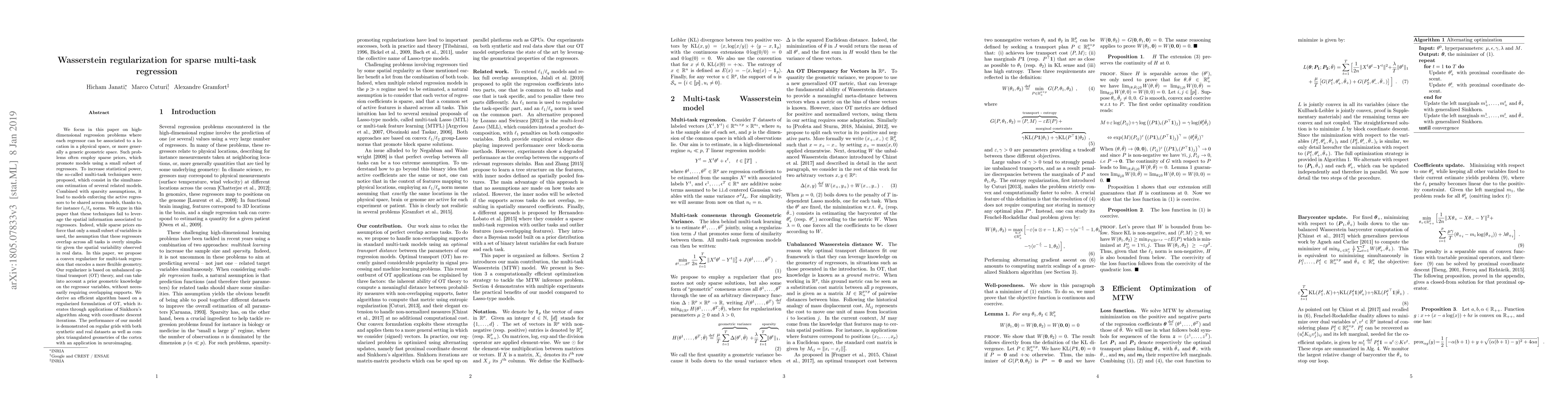 The paper proposes a convex regularizer for multi-task regression using unbalanced optimal transport (OT) theory, which can incorporate prior geometric knowledge on regressor variables without requiring overlapping supports. It introduces a Multi-task Wasserstein (MTW) model, solved efficiently via proximal coordinate descent and Sinkhorn's algorithm.