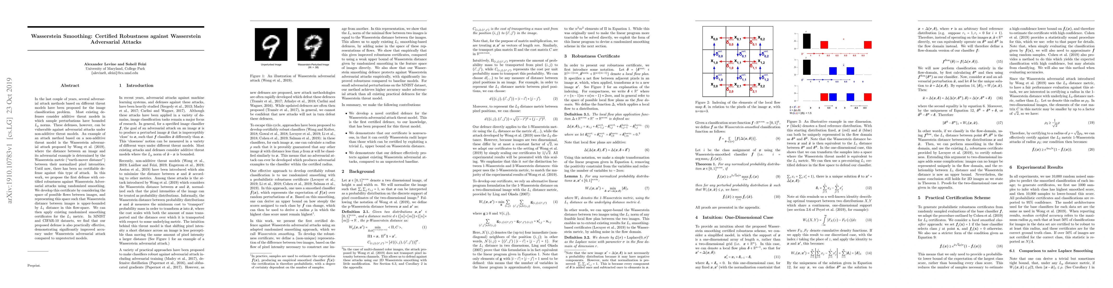 This paper proposes a defense mechanism called Wasserstein Smoothing to achieve certified robustness against Wasserstein adversarial attacks, which differ from typical L_p norm-based threats. The approach leverages randomized smoothing and a flow-space representation to ensure the Wasserstein distance is upper-bounded by L_1 distance, thus applying existing L_1 certificates. The method shows improved performance on MNIST and CIFAR-10 datasets against Wasserstein adversarial examples.