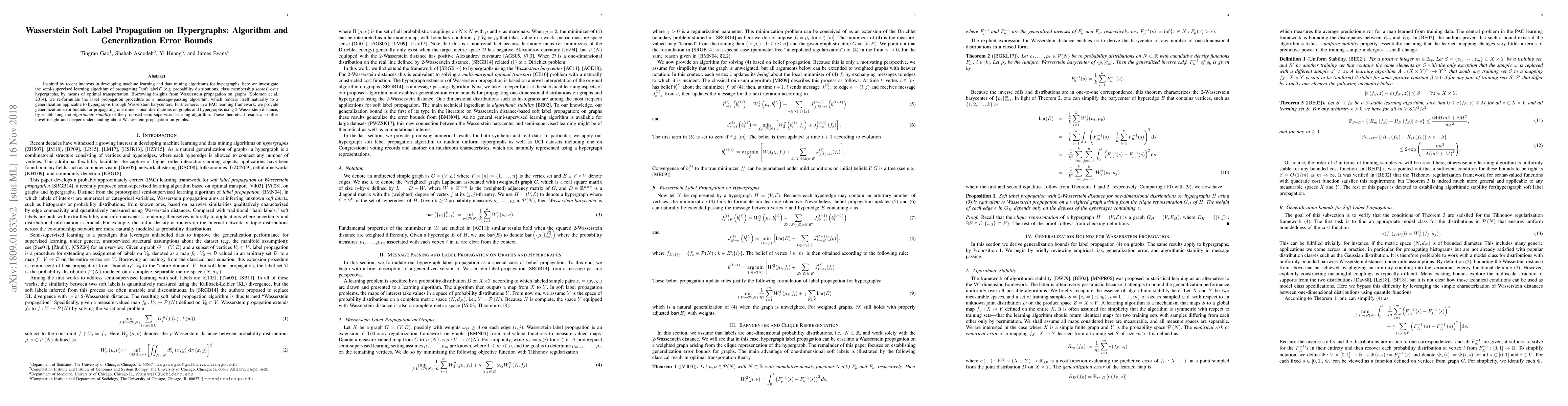 This paper proposes a semi-supervised learning algorithm for hypergraphs based on Wasserstein soft label propagation, reformulating label propagation as a message-passing algorithm using Wasserstein barycenters. It also provides generalization error bounds in a PAC learning framework, establishing algorithmic stability and offering insights into Wasserstein propagation on graphs.