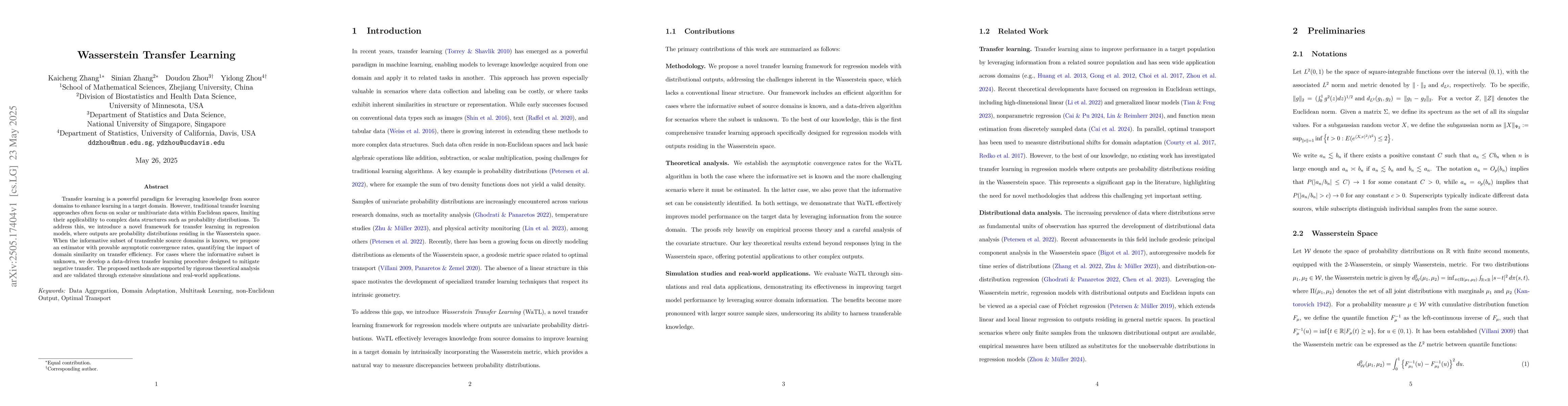 The paper proposes a novel transfer learning framework for regression models where outputs are probability distributions in Wasserstein space, addressing limitations of traditional methods restricted to Euclidean spaces.