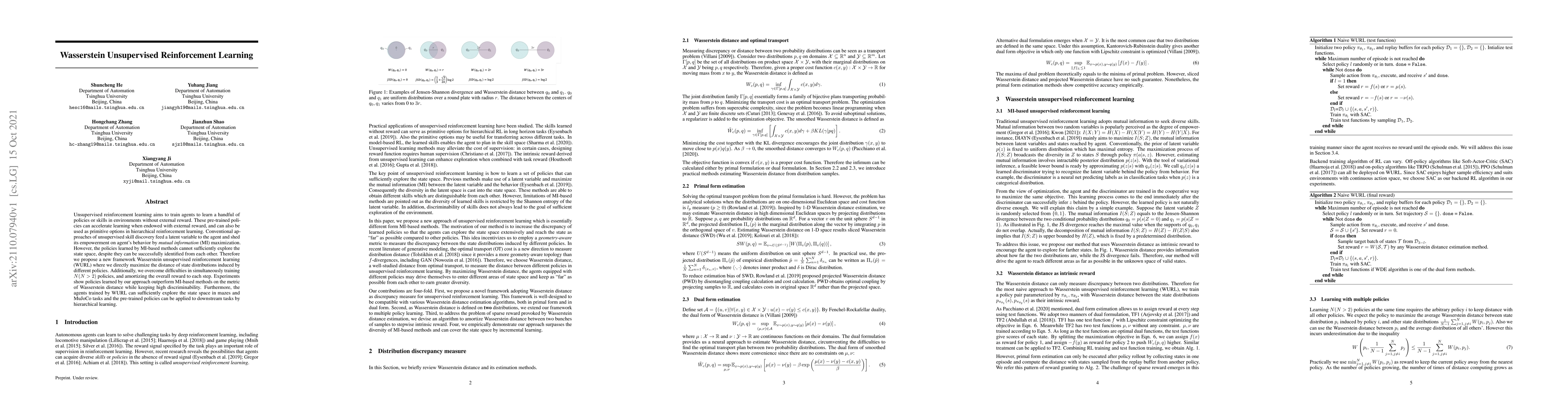 The paper proposes Wasserstein Unsupervised Reinforcement Learning (WURL) to improve skill discovery in environments without external rewards by maximizing the distance between state distributions induced by different policies, leading to better state space exploration and policy discriminability compared to mutual information-based methods. The approach also effectively trains multiple policies and amortizes rewards, demonstrating superior performance in mazes and MuJoCo tasks.