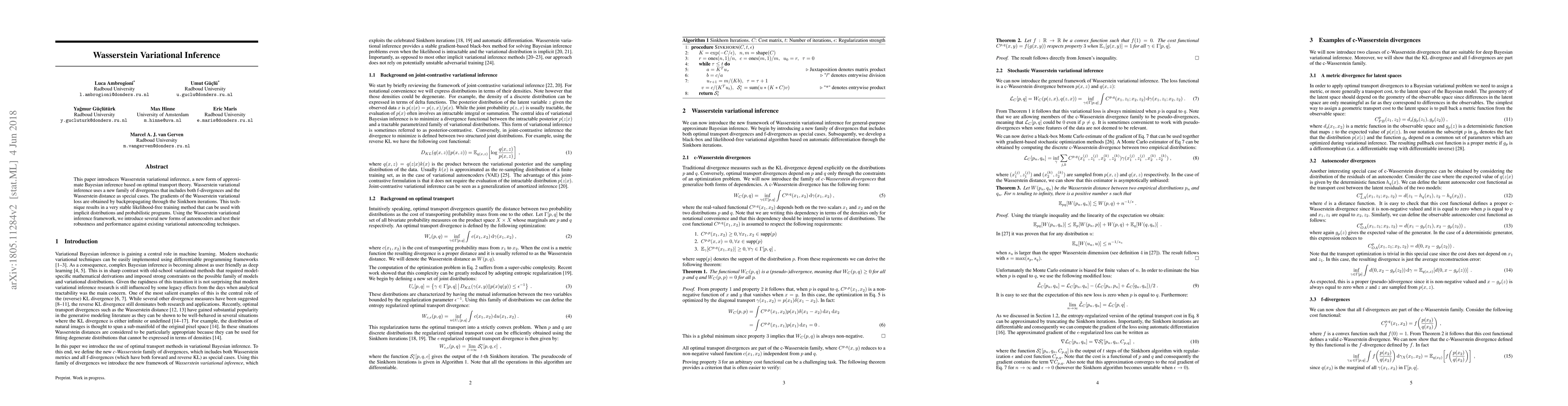 This paper proposes Wasserstein variational inference, a novel Bayesian inference method leveraging optimal transport theory and a new family of divergences. It employs stable, likelihood-free training via backpropagation through Sinkhorn iterations, and tests its effectiveness with new autoencoders against traditional variational autoencoders.