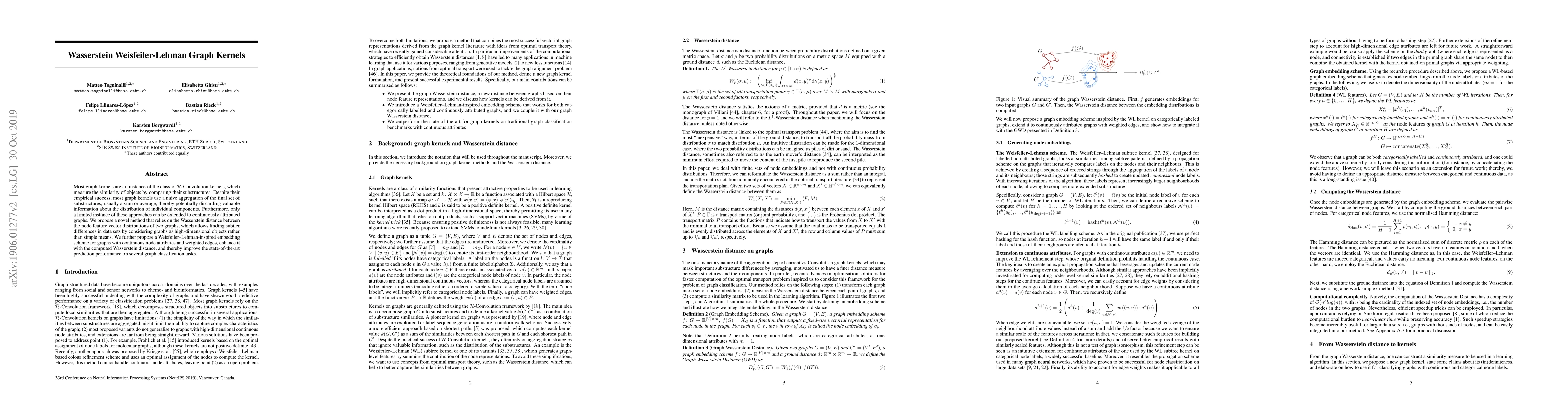 Most graph kernels are an instance of the class of $\mathcal{R}$-Convolution kernels, which measure the similarity of objects by comparing their substructures. Despite their empirical success, most graph kernels use a naive aggregation of the final set of substructures, usually a sum or average, thereby potentially discarding valuable information about the distribution of individual components. Furthermore, only a limited instance of these approaches can be extended to continuously attributed graphs. We propose a novel method that relies on the Wasserstein distance between the node feature vector distributions of two graphs, which allows to find subtler differences in data sets by considering graphs as high-dimensional objects, rather than simple means. We further propose a Weisfeiler-Lehman inspired embedding scheme for graphs with continuous node attributes and weighted edges, enhance it with the computed Wasserstein distance, and thus improve the state-of-the-art prediction performance on several graph classification tasks.