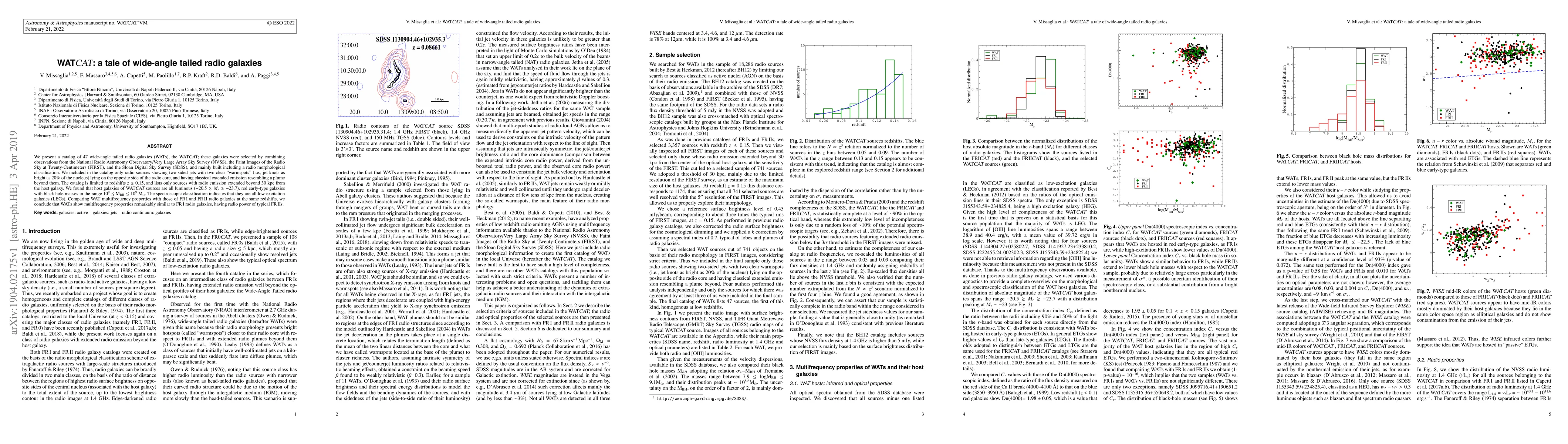 The WATCAT catalog presents 47 wide-angle tailed radio galaxies selected from combined radio and optical surveys, characterized by two-sided jets and extended radio plumes. The host galaxies are luminous red early-type galaxies with black hole masses between $10^8$ and $10^9$ M$_\odot$, and are classified as low-excitation galaxies.