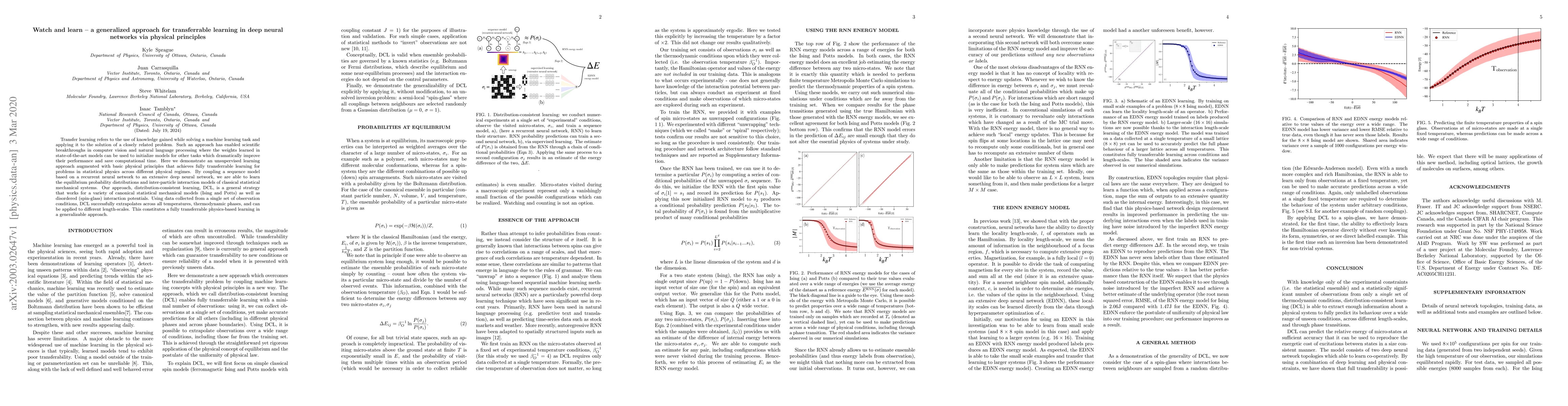 Transfer learning refers to the use of knowledge gained while solving a machine learning task and applying it to the solution of a closely related problem. Such an approach has enabled scientific breakthroughs in computer vision and natural language processing where the weights learned in state-of-the-art models can be used to initialize models for other tasks which dramatically improve their performance and save computational time. Here we demonstrate an unsupervised learning approach augmented with basic physical principles that achieves fully transferrable learning for problems in statistical physics across different physical regimes. By coupling a sequence model based on a recurrent neural network to an extensive deep neural network, we are able to learn the equilibrium probability distributions and inter-particle interaction models of classical statistical mechanical systems. Our approach, distribution-consistent learning, DCL, is a general strategy that works for a variety of canonical statistical mechanical models (Ising and Potts) as well as disordered (spin-glass) interaction potentials. Using data collected from a single set of observation conditions, DCL successfully extrapolates across all temperatures, thermodynamic phases, and can be applied to different length-scales. This constitutes a fully transferrable physics-based learning in a generalizable approach.
