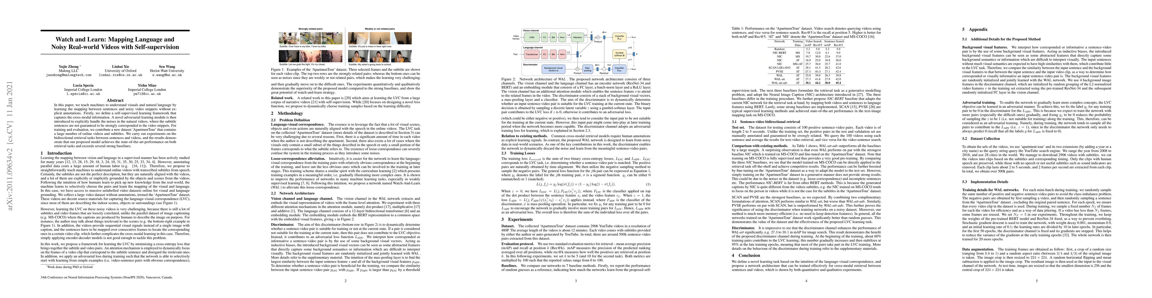 In this paper, we teach machines to understand visuals and natural language by learning the mapping between sentences and noisy video snippets without explicit annotations. Firstly, we define a self-supervised learning framework that captures the cross-modal information. A novel adversarial learning module is then introduced to explicitly handle the noises in the natural videos, where the subtitle sentences are not guaranteed to be strongly corresponded to the video snippets. For training and evaluation, we contribute a new dataset `ApartmenTour' that contains a large number of online videos and subtitles. We carry out experiments on the bidirectional retrieval tasks between sentences and videos, and the results demonstrate that our proposed model achieves the state-of-the-art performance on both retrieval tasks and exceeds several strong baselines. The dataset can be downloaded at https://github.com/zyj-13/WAL.