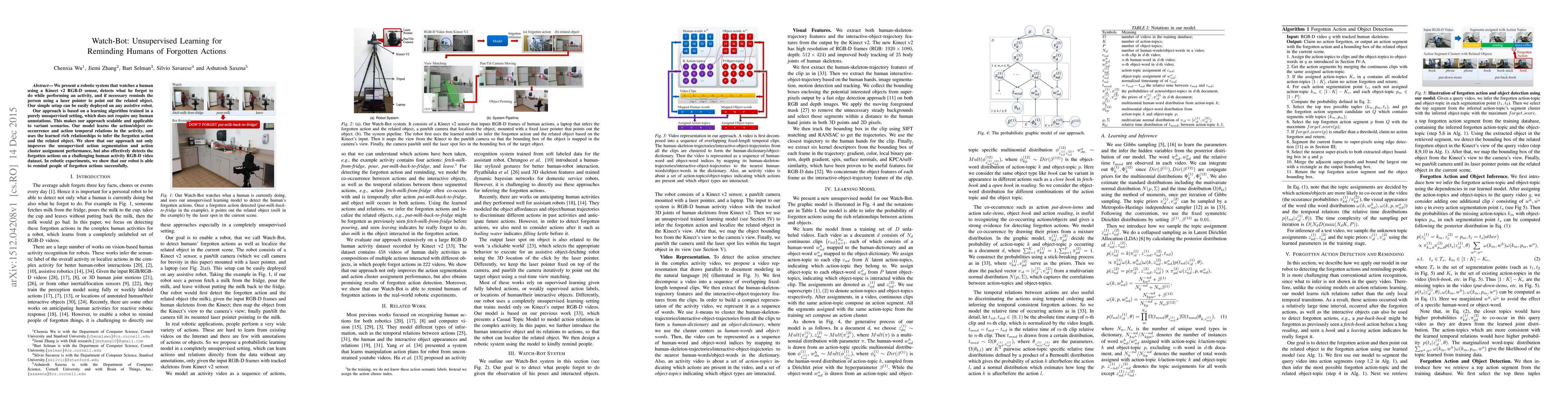 The paper introduces Watch-Bot, a robot system using unsupervised learning to identify and remind humans of forgotten actions during activities, utilizing a Kinect v2 sensor. The method requires no human annotations, making it scalable and adaptable to various scenarios. The system learns action/object co-occurrence and temporal relations to infer missing actions, improving unsupervised action segmentation and cluster assignment. Successful reminders are demonstrated in robotic experiments with a challenging human activity RGB-D video dataset.