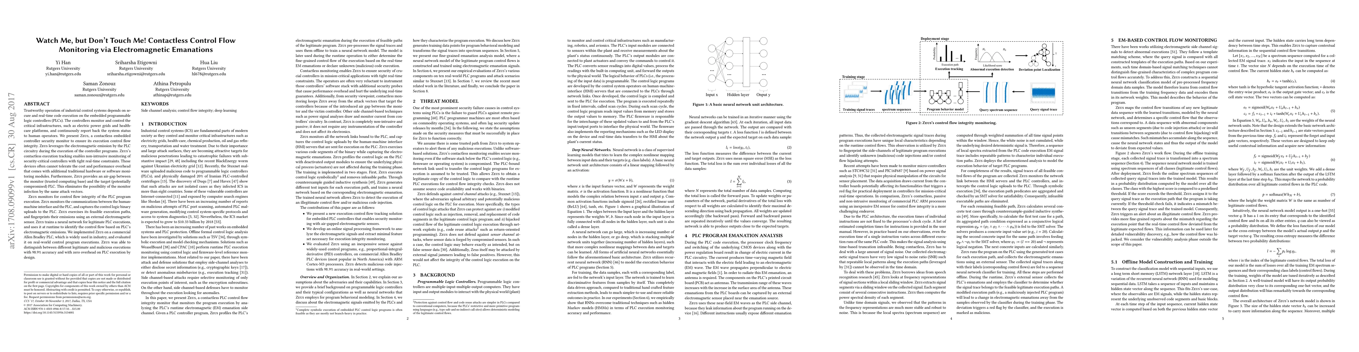 The research introduces Zeus, a contactless security monitor for industrial PLCs that ensures execution control flow integrity by analyzing electromagnetic emissions. Zeus, implemented on a widely-used Allen Bradley PLC, accurately distinguishes between legitimate and malicious executions with 98.9% accuracy and zero overhead on PLC execution.