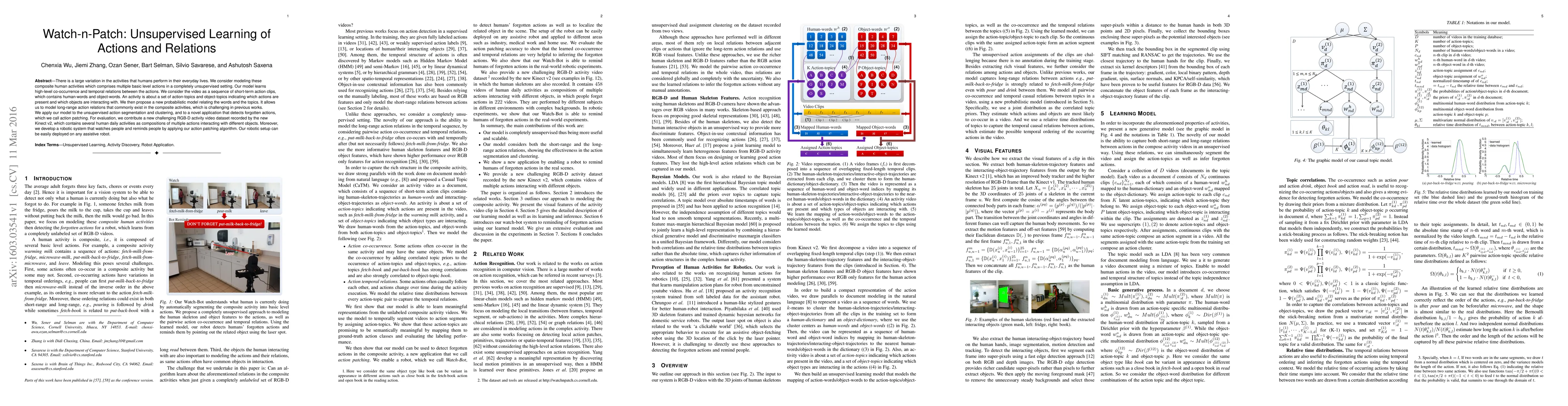 This paper introduces Watch-n-Patch, an unsupervised learning model for human activities, breaking them into basic actions and objects. It uses a new probabilistic model to capture long-range action relations in composite activities. The method is applied to action segmentation, clustering, and a novel 'action patching' for forgotten actions. It's evaluated on a new RGB-D activity dataset and demonstrated on a robotic system for assistive applications.