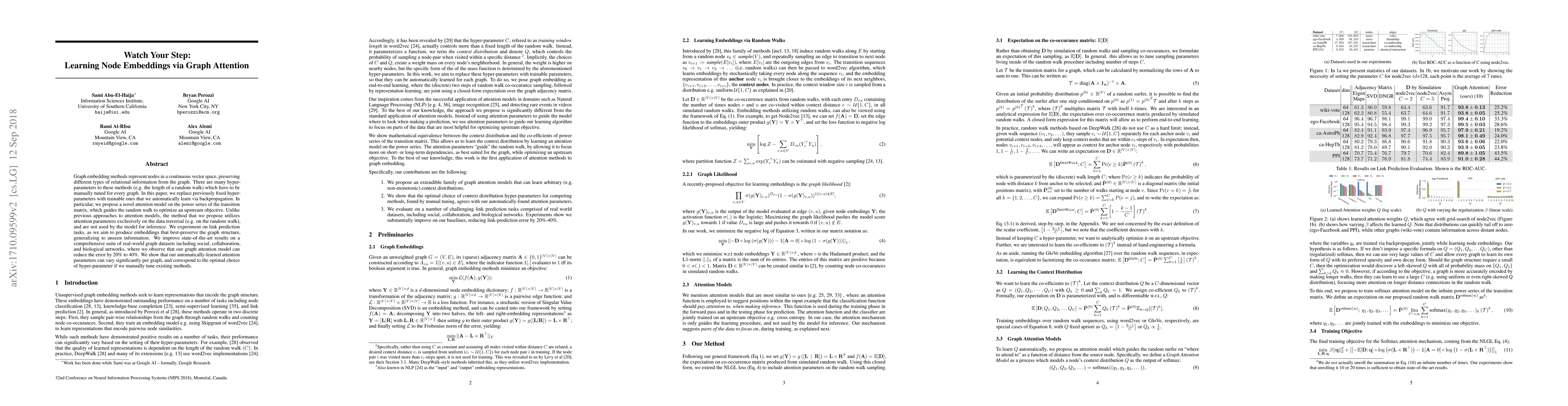 This paper proposes a novel method for learning node embeddings via graph attention, which improves state-of-the-art performance on real-world datasets by 20-45% and allows for automatic tuning of hyperparameters.