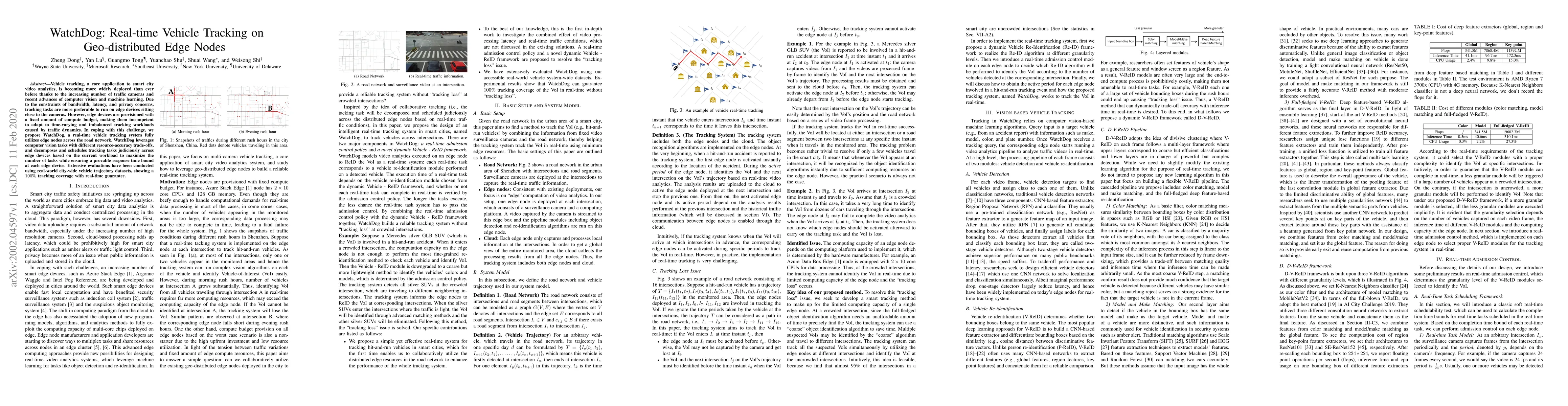 WatchDog is a real-time vehicle tracking system designed to optimize edge devices for smart city applications, addressing bandwidth, latency, and privacy issues. It effectively schedules tracking tasks across distributed edge nodes to ensure 100% coverage and real-time performance, even under varying traffic conditions.