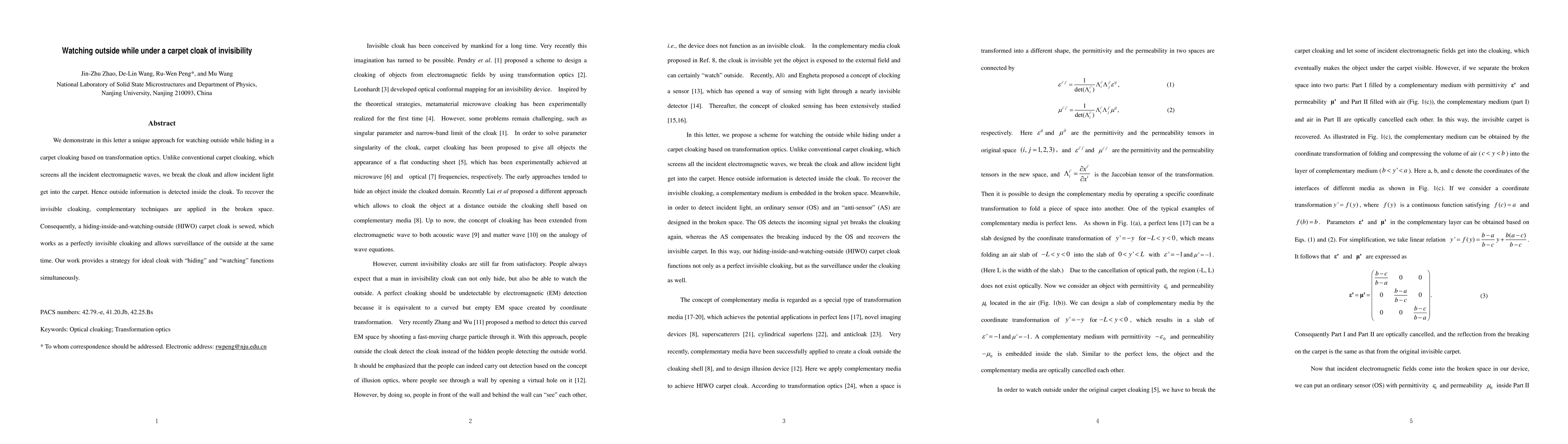 This paper presents a novel carpet cloaking technique that allows for surveillance outside while remaining invisible. Unlike traditional cloaking, this method permits incident light to enter the cloak, enabling observation of the exterior, and uses complementary techniques to maintain invisibility.
