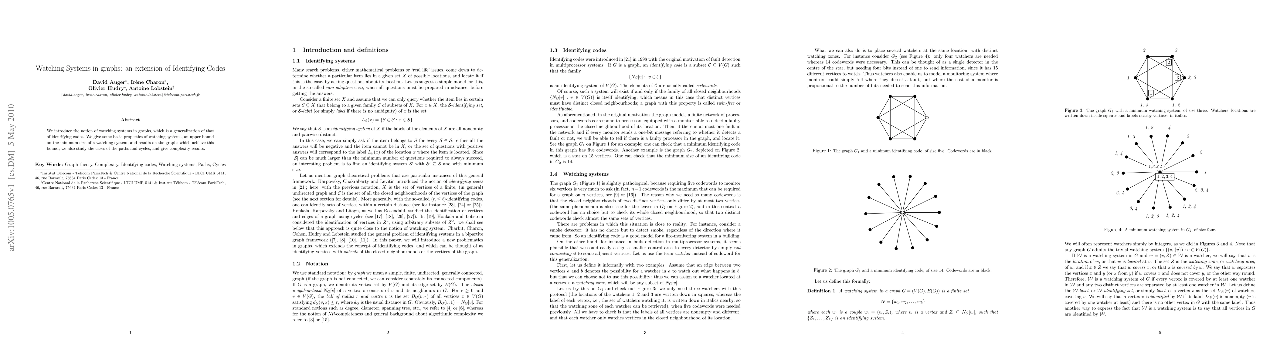 This research introduces 'watching systems' in graphs, extending the concept of identifying codes. It provides properties, an upper size bound for watching systems, and examines paths and cycles, also delivering complexity results.