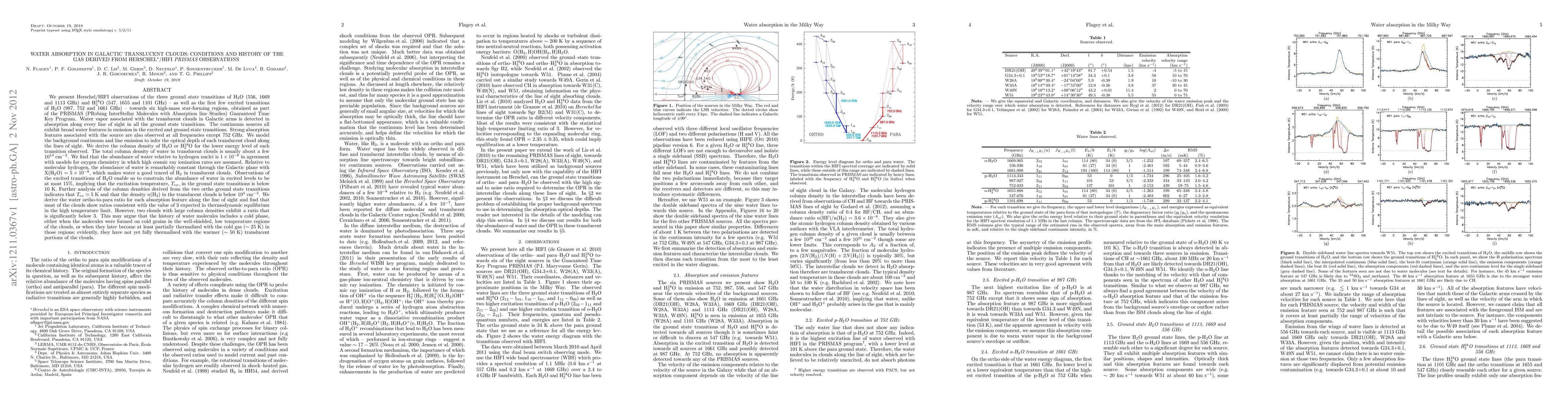 We present Herschel/HIFI observations of nine transitions of \hho and \hheo towards six high-mass star-forming regions, obtained as part of the PRISMAS Key Program. Water vapor in translucent clouds is detected in absorption along every sightline. We derive the column density of \hho or \hheo for the lower energy level of each transition observed. The total water column density is about a few $10^{13} \rm{cm^{-2}}$. We find that the abundance of water relative to hydrogen nuclei is $1\times10^{-8}$ in agreement with models for oxygen chemistry with high cosmic ray ionization rates. Relative to \hh, the abundance of water is remarkably constant at $5\times10^{-8}$. The abundance of water in excited levels is at most 15%, implying that the excitation temperature $T_{ex}$ in the ground state transitions is below 10 K. The column densities derived from the two ortho ground state transitions indicates that $T_{ex}\simeq5$ K and that the density $n($\hh$)$ in the clouds is $\le10^4 \rm{cm^{-3}}$. For most clouds we derive a water ortho-to-para ratio consistent with the value of 3 expected in thermodynamic equilibrium in the high temperature limit. Two clouds with large column densities exhibit a ratio significantly below 3. This may argue that the history of water molecules includes a cold phase, either when the molecules were formed on cold grains, or when they later become at least partially thermalized with the cold gas ($\sim25$ K) in the shielded, low temperature regions of the clouds; evidently, they have not yet fully thermalized with the warmer ($\sim50$ K) translucent portions of the clouds.