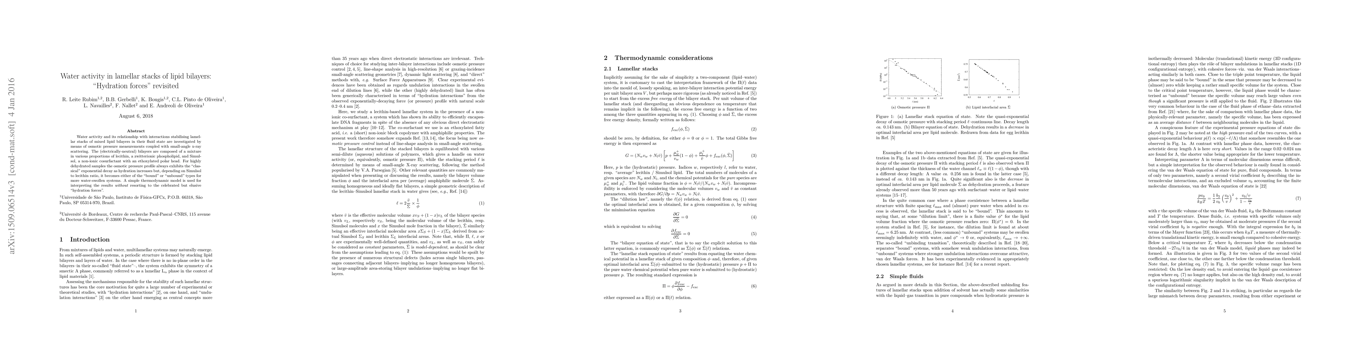 This study investigates the water activity and stabilizing interactions in lamellar stacks of mixed lipid bilayers using osmotic pressure measurements and small-angle x-ray scattering. The findings reveal distinct osmotic pressure profiles based on the ratio of lecithin and Simulsol, challenging the concept of "hydration forces" with a simple thermodynamic model.