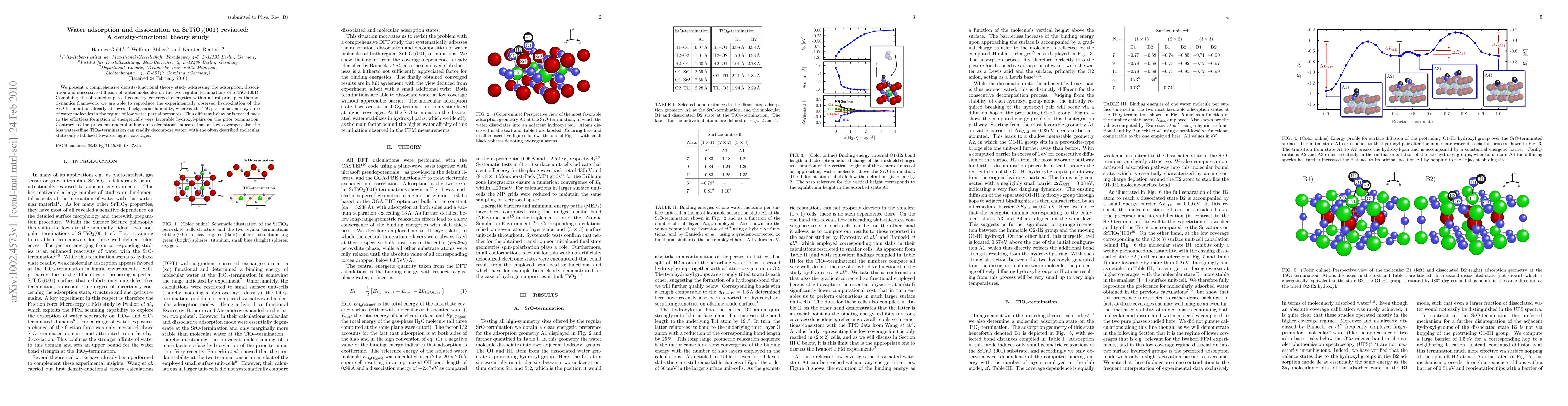 The study revisits water adsorption and dissociation on SrTiO3(001) using density-functional theory, revealing that the SrO-termination easily forms hydroxyl pairs even at low humidity, while the TiO2-termination can decompose water at low coverages contrary to prior beliefs.