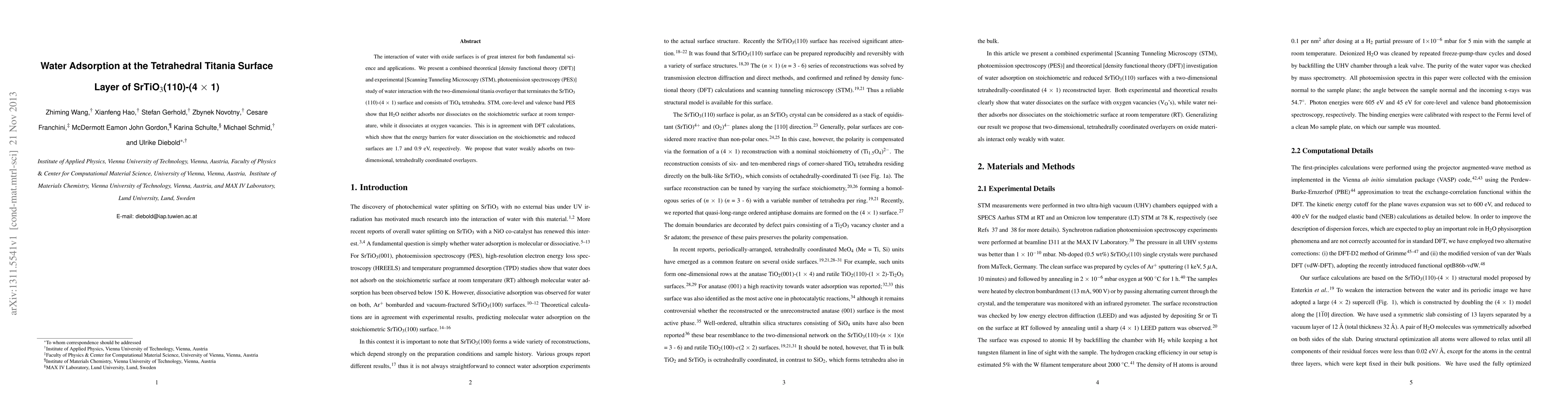 The interaction of water with oxide surfaces is of great interest for both fundamental science and applications. We present a combined theoretical [density functional theory (DFT)] and experimental [Scanning Tunneling Microscopy (STM), photoemission spectroscopy (PES)] study of water interaction with the two-dimensional titania overlayer that terminates the SrTiO$_3$(110)-(4$\times$1) surface and consists of TiO$_4$ tetrahedra. STM, core-level and valence band PES show that H$_2$O neither adsorbs nor dissociates on the stoichiometric surface at room temperature, while it dissociates at oxygen vacancies. This is in agreement with DFT calculations, which show that the energy barriers for water dissociation on the stoichiometric and reduced surfaces are 1.7 and 0.9 eV, respectively. We propose that water weakly adsorbs on two-dimensional, tetrahedrally coordinated overlayers.