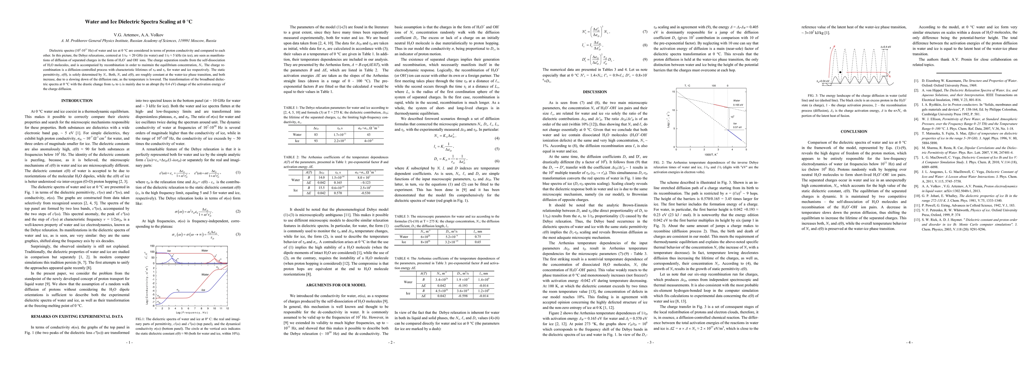This paper investigates the dielectric spectra of water and ice at 0°C, attributing the observed Debye relaxations to proton conductivity and charge diffusion. The study reveals that the significant difference in relaxation frequencies between water and ice is due to a substantial change in the activation energy for charge diffusion.