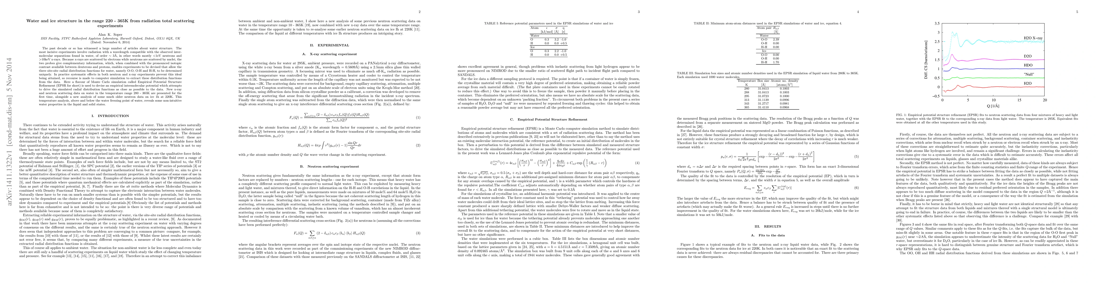The past decade or so has witnessed a large number of articles about water structure. The most incisive experiments involve radiation with a wavelength compatible with the observed inter-molecular separations found in water, of order $\sim 3$\AA, in other words mostly $<$1eV neutrons and $>$10keV x-rays. Because x-rays are scattered by electrons while neutrons are scattered by nuclei, the two probes give complementary information about the three site-site radial distribution functions for water, namely O-O, O-H and H-H. Here a version of Monte Carlo simulation called Empirical Potential Structure Refinement is used to devise an empirical intermolecular potential which attempts to drive the simulated radial distribution functions as close as possible to the data. New x-ray and neutron scattering data on water in the temperature range 280 - 365K are presented for the first time, alongside a new analysis of some much older neutron data on ice 1h at 220K. This temperature analysis, above and below the water freezing point of water, reveals some non-intuitive water properties in the liquid and solid states.