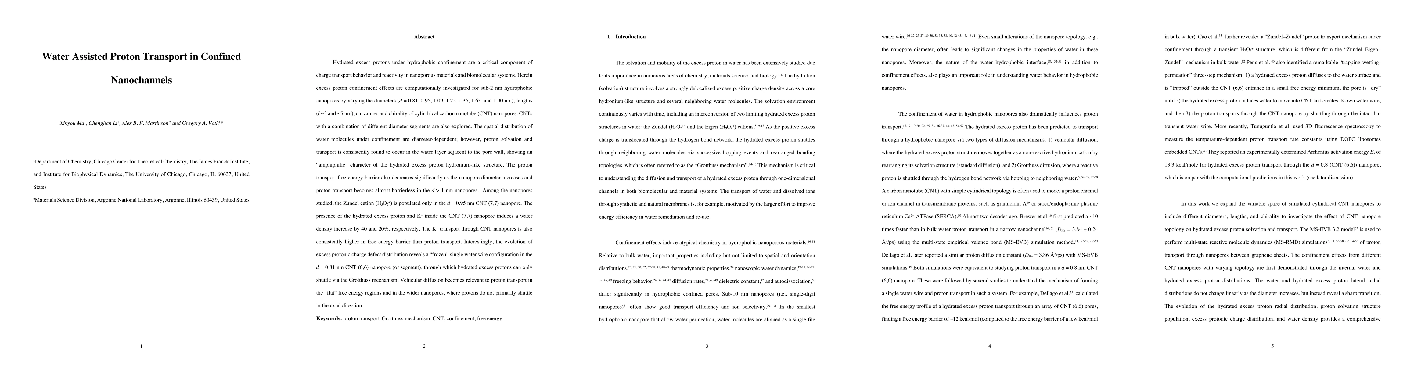 This study computationally investigates proton transport in hydrophobic carbon nanotube nanopores of varying sizes and geometries, revealing that proton solvation and transport predominantly occur in the water layer near the pore wall. The proton transport free energy barrier decreases with larger nanopore diameters, becoming nearly barrierless for d > 1 nm.