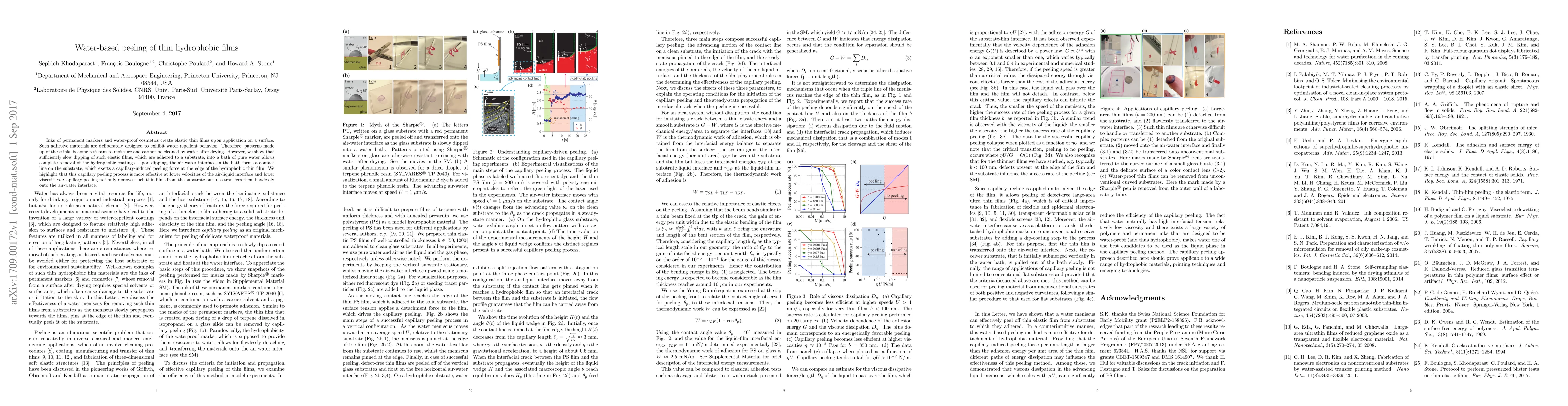 The paper presents a novel water-based peeling method utilizing capillary-induced peeling force for removing thin hydrophobic films from substrates, highlighting the roles of interfacial energies, velocities, and film thickness.