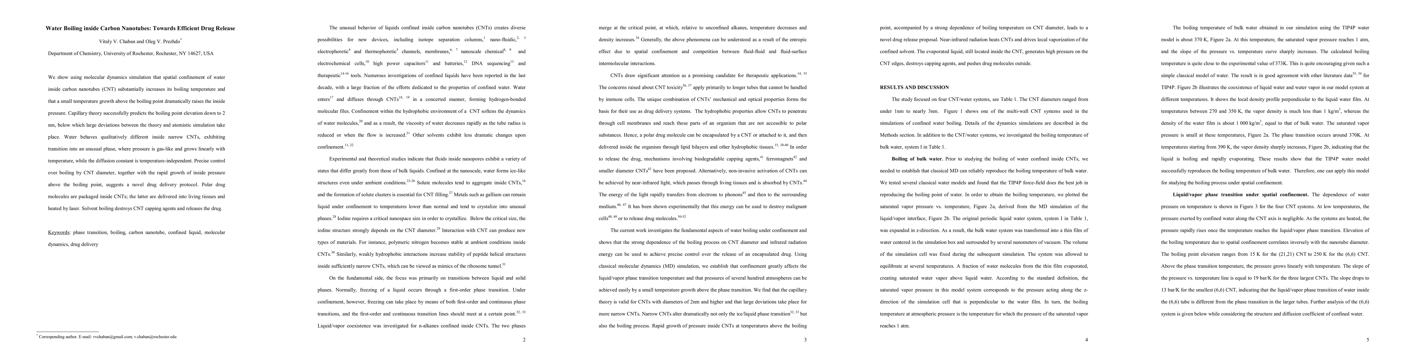 This research demonstrates that water inside carbon nanotubes exhibits a significantly elevated boiling point, leading to a rapid increase in internal pressure upon heating. This unique behavior opens up a potential method for controlled drug release by using laser-induced heating to trigger the boiling of water inside the nanotubes, thereby releasing encapsulated drugs.