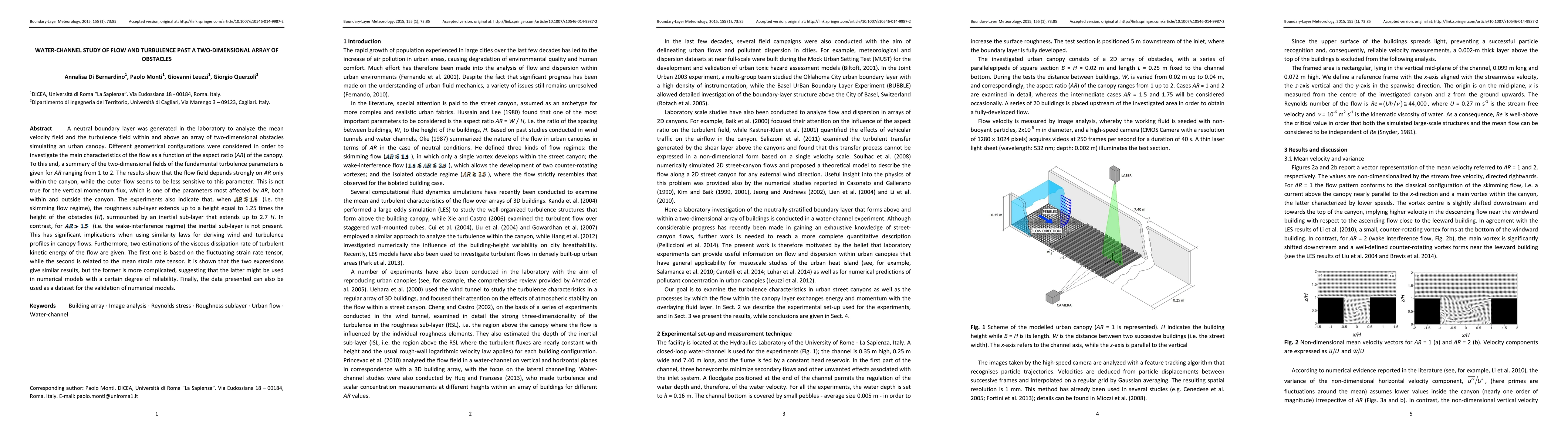 Researchers studied airflow past a 2D array of obstacles mimicking urban canopies, finding flow patterns depend on aspect ratio within the canyon but less so outside, with implications for wind and turbulence profiles.