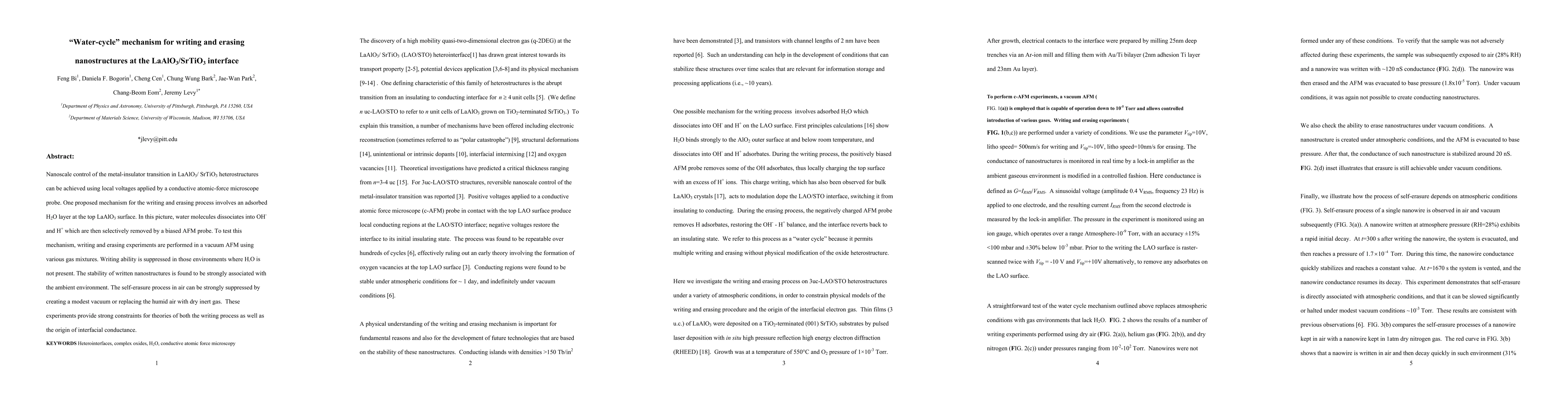 The paper presents a 'water-cycle' mechanism for writing and erasing nanostructures at the LaAlO3/SrTiO3 interface, emphasizing the role of adsorbed H2O layers and their manipulation via a biased AFM probe.