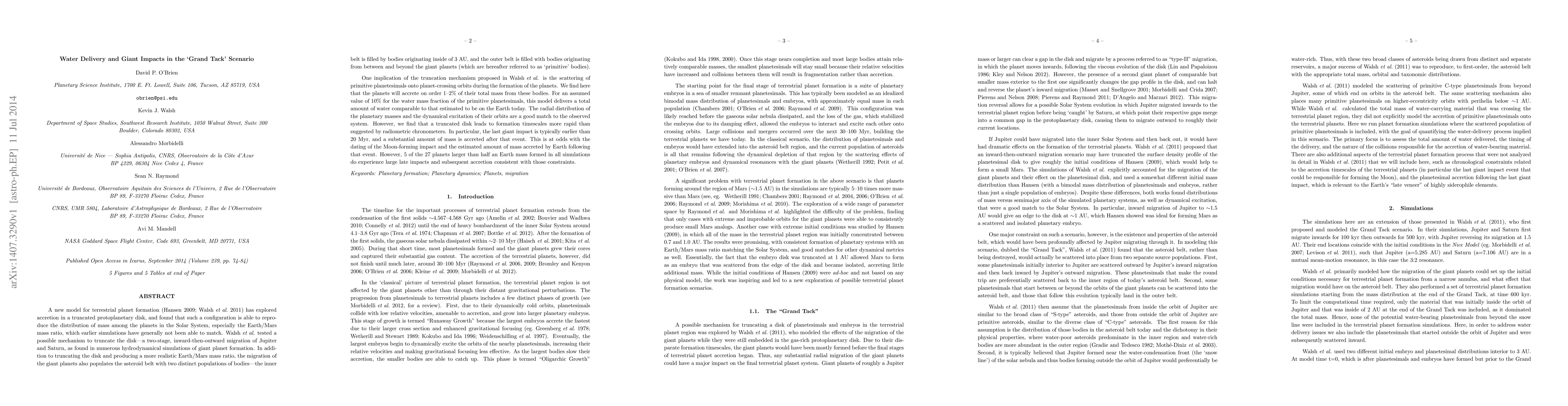 A new model for terrestrial planet formation (Hansen 2009, Walsh et al. 2011) has explored accretion in a truncated protoplanetary disk, and found that such a configuration is able to reproduce the distribution of mass among the planets in the Solar System, especially the Earth/Mars mass ratio, which earlier simulations have generally not been able to match. Walsh et al. tested a possible mechanism to truncate the disk--a two-stage, inward-then-outward migration of Jupiter and Saturn, as found in numerous hydrodynamical simulations of giant planet formation. In addition to truncating the disk and producing a more realistic Earth/Mars mass ratio, the migration of the giant planets also populates the asteroid belt with two distinct populations of bodies--the inner belt is filled by bodies originating inside of 3 AU, and the outer belt is filled with bodies originating from between and beyond the giant planets (which are hereafter referred to as `primitive' bodies). We find here that the planets will accrete on order 1-2% of their total mass from primitive planetesimals scattered onto planet-crossing orbits during the formation of the planets. For an assumed value of 10% for the water mass fraction of the primitive planetesimals, this model delivers a total amount of water comparable to that estimated to be on the Earth today. While the radial distribution of the planetary masses and the dynamical excitation of their orbits are a good match to the observed system, we find that the last giant impact is typically earlier than 20 Myr, and a substantial amount of mass is accreted after that event. However, 5 of the 27 planets larger than half an Earth mass formed in all simulations do experience large late impacts and subsequent accretion consistent with the dating of the Moon-forming impact and the estimated amount of mass accreted by Earth following that event.