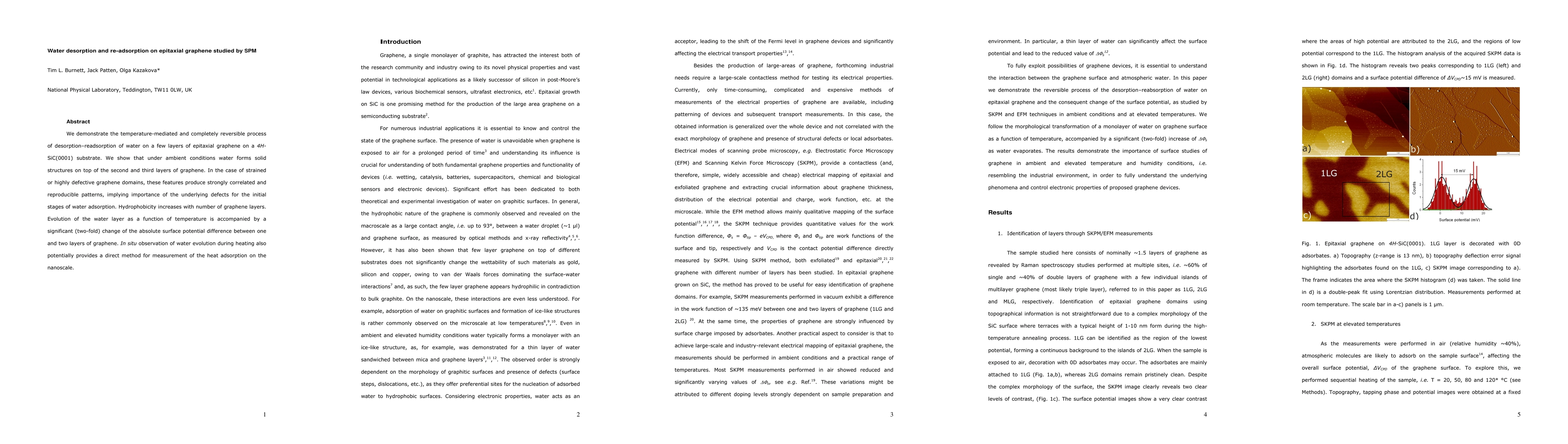 This study investigates the reversible desorption-re-adsorption of water on epitaxial graphene layers on 4H-SiC, revealing significant surface potential changes and the influence of substrate defects on adsorption. The findings suggest that hydrophobicity increases with more graphene layers and that temperature-mediated processes can measure nanoscale heat adsorption.