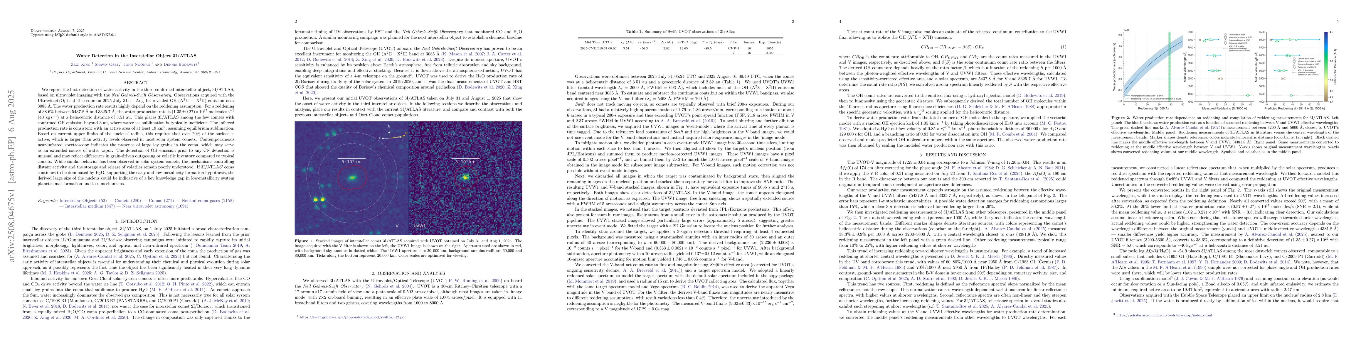 The research utilized ultraviolet imaging with the Neil Gehrels-Swift Observatory to detect water activity in the interstellar object 3I/ATLAS, specifically observing OH (A2Σ -- X2Π) emission near 3085 Å.