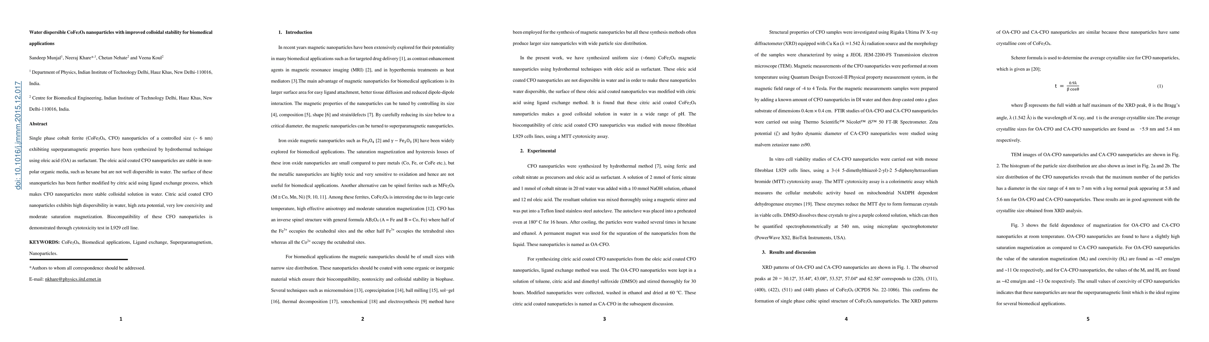 This paper synthesizes CoFe2O4 nanoparticles via hydrothermal method using oleic acid, then modifies them with citric acid for enhanced water dispersibility. The citric acid-coated nanoparticles show high stability in water, biocompatibility, and suitable magnetic properties for biomedical applications.