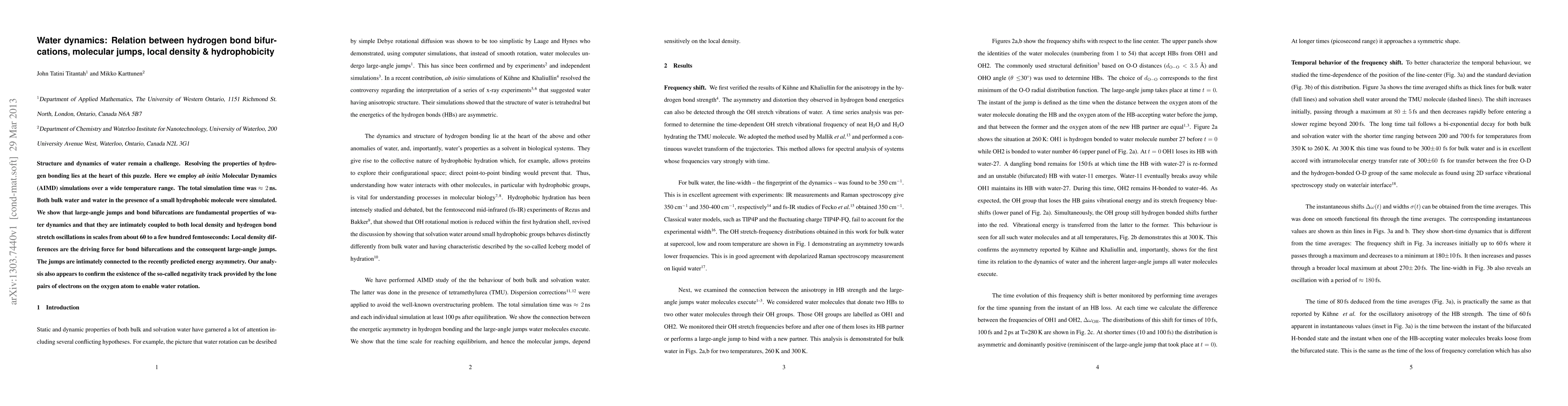 The paper presents a detailed analysis of water dynamics using ab initio MD simulations, revealing the connection between hydrogen bond bifurcations, molecular jumps, local density, and hydrophobicity.